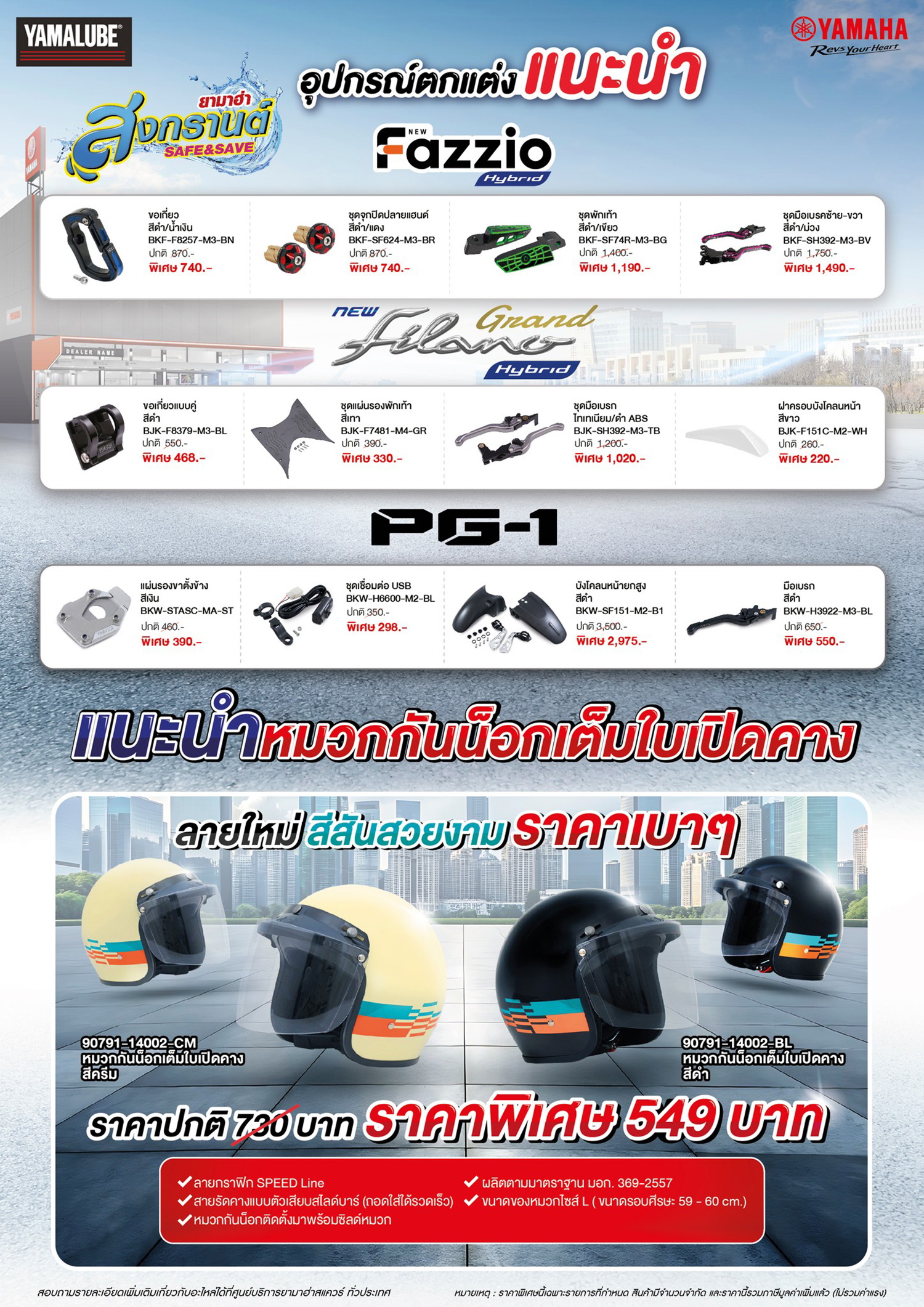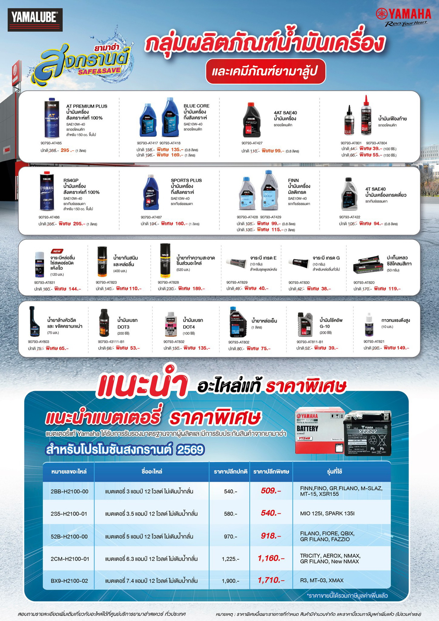 บริษัท ไทยยามาฮ่ามอเตอร์ จำกัด จัดแคมเปญสุดพิเศษ สงกรานต์ SAFE & SAVE เพื่อให้ลูกค้ายามาฮ่าได้เตรียมความพร้อมให้กับรถยามาฮ่าคู่ใจเพื่อใช้ขับขี่อย่างปลอดภัยในช่วงเทศกาลปีใหม่ไทย โดยลูกค้ายามาฮ่าสามารถนำรถจักรยานยนต์เข้าศูนย์บริการยามาฮ่า เพื่อตรวจเช็คสภาพรถ ฟรี! 10 รายการ ได้แก่