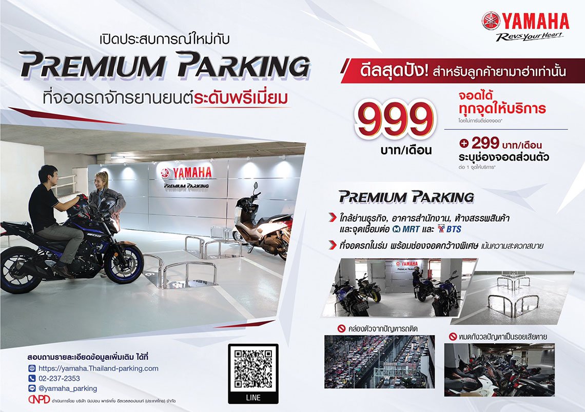 โดยลูกค้ายามาฮ่าที่สนใจใช้บริการ YAMAHA PREMIUM PARKING สามารถลงทะเบียนผ่านช่องทางออนไลน์ที่ http://yamaha.thailand-parking.com เพื่อใช้บริการที่จอดรถสุดพรีเมียม 9 แห่งได้แล้ววันนี้ พร้อมด้วยโปรโมชั่นสุดพิเศษด้วยค่าบริการเพียง 999 บาท/เดือน หรือจ่ายเพิ่ม 299 บาท/เดือน เพื่อจับจองช่องจอดประจำส่วนตัว