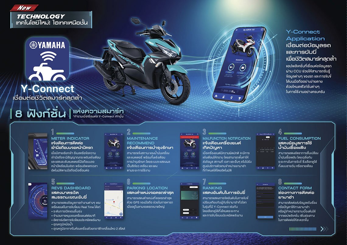 All New YAMAHA AEROX มาพร้อมกับ NEW TECHNOLOGY เทคโนโลยีใหม่! ไฮเทคเหนือชั้นแอพลิเคชั่น Y-Connect เชื่อมต่อชีวิตสมาร์ทสุดล้ำ โดยเป็นแอพพลิเคชั่นที่เชื่อมต่อข้อมูลรถผ่าน CCU ช่วยให้สามารถรับรู้ข้อมูลต่างๆ ของรถและลักษณะการขับขี่ที่แสดงผลบนสมาร์ทโฟนอย่างง่ายดาย ด้วยโหมดฟังก์ชันต่างๆ ในการใช้งานอย่างครบครัน ช่วยให้หมดกังวลในการใช้งาน สะดวกสบาย สนุกเร้าใจในการขับขี่ ซึ่งมีด้วยกันถึง 8 ฟังก์ชั่น คือ