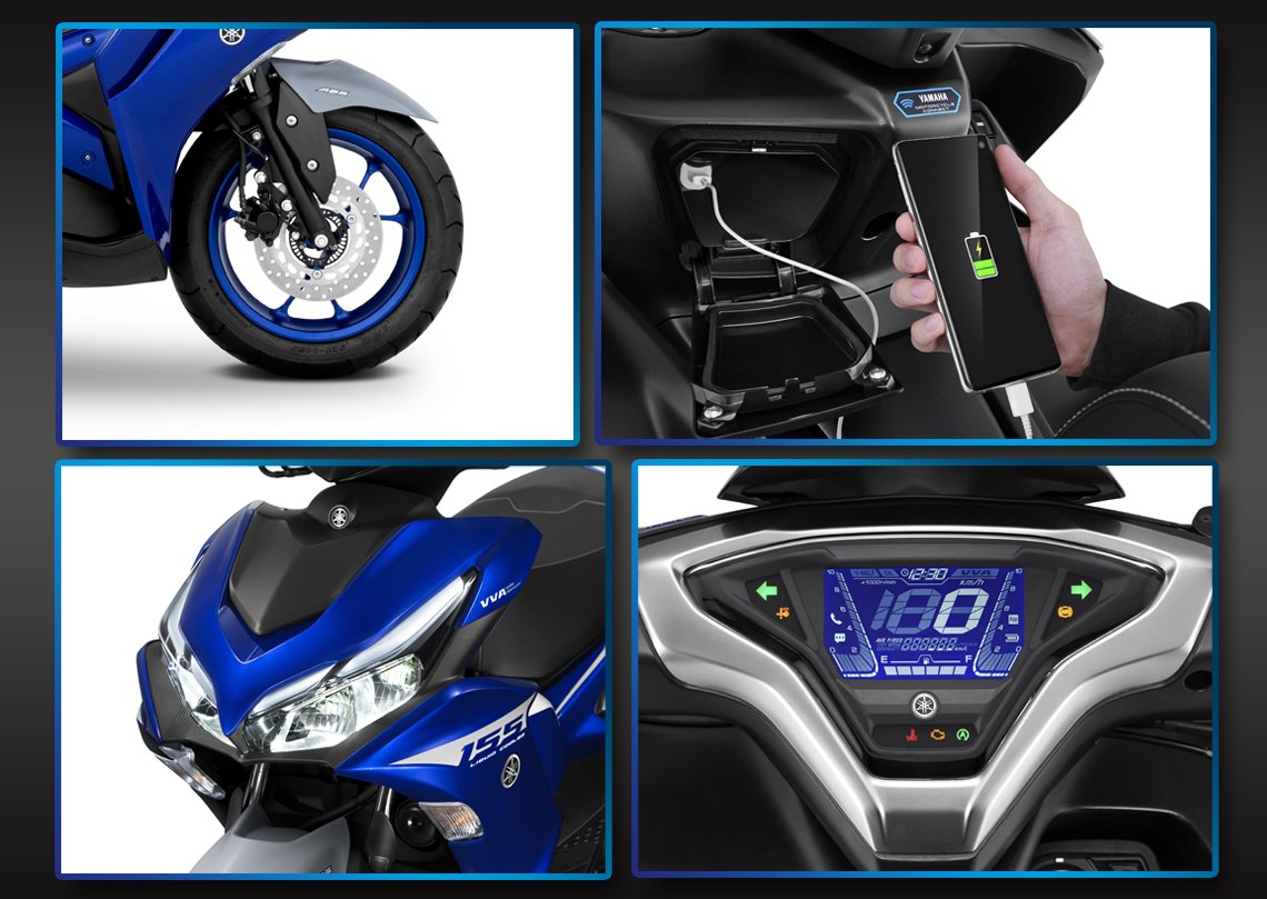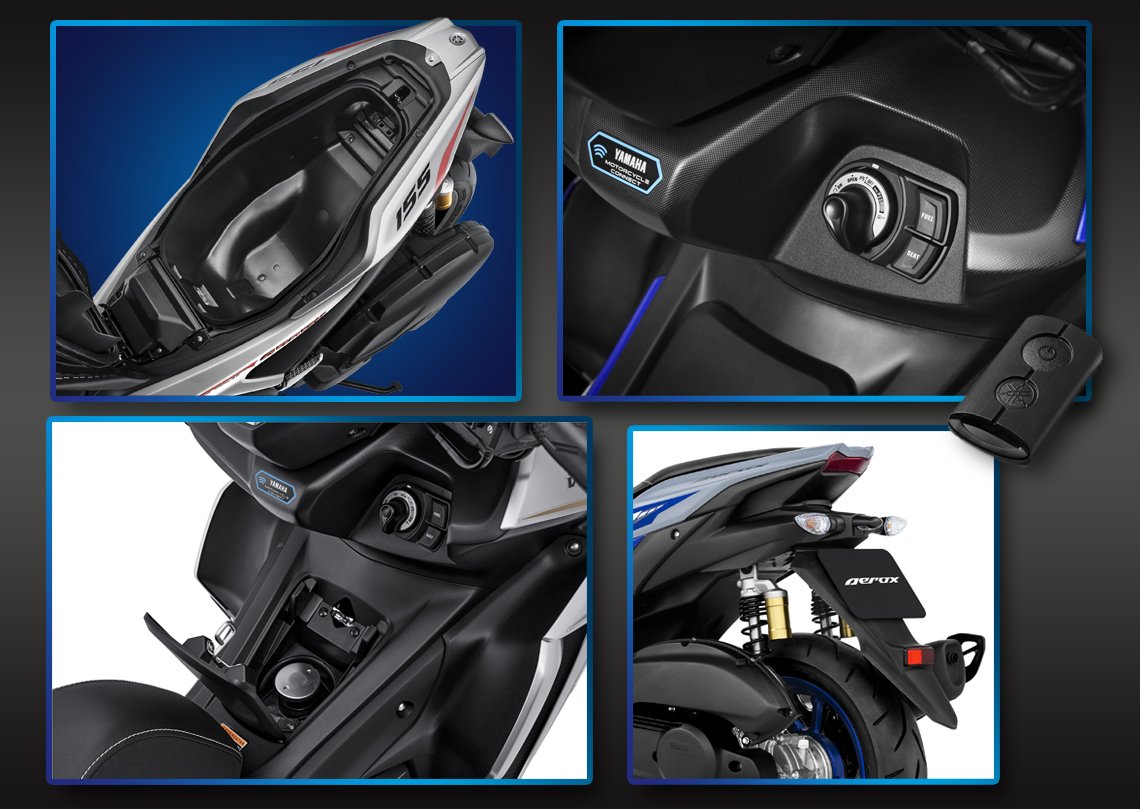 All New YAMAHA AEROX ยังโดดเด่นด้วยฟีเจอร์ใหม่สุดล้ำ! ด้วย New! LCD DIGITAL SPORT METER หน้าจอดิจิทัลแบบ LCD ใหม่! สปอร์ตจัดเร้าใจด้วยกราฟิกแสดงผลวัดรอบแบบใหม่ พร้อมแสดงผลครบทุกฟังก์ชั่น รวมทั้งการเชื่อมต่อกับแอพพลิเคชั่น Y-Connect และฟังก์ชั่นใหม่สวิตซ์เปลี่ยนโหมดหน้าจอง่ายขึ้นที่แฮนด์ซ้าย พรีเมี่ยมสุด! ด้วย SMART KEY SYSTEM ระบบกุญแจรีโมทอัจฉริยะ (เฉพาะรุ่น ABS) สะดวกสบายในการเปิดหรือปิด สตาร์ทหรือดับเครื่องยนต์ / ปลดล็อคแฮนด์ / ปลดล็อคเบาะ / ปลดล็อคฝาถังน้ำมัน พร้อมสัญญาณ ANSWER BACK ตอบสนองการใช้งานอย่างต่อเนื่องด้วย D/C CHARGING SOCKET ช่องเสียบเพื่อชาร์จแบตเตอรี่มือถือ ช่วยให้ไม่พลาดทุกการติดต่อ และช่องเก็บของด้านหน้าพร้อมฝาปิด รวมถึง MEGA BOX ที่เก็บของขนาดใหญ่ความจุ 25 ลิตร เก็บของได้จุใจ ใส่หมวกกันน็อคแบบเต็มใบได้ และเติมน้ำมันได้ง่ายด้วยฝาถังน้ำมันด้านหน้า พร้อม New! FUEL TANK 5.5L ถังน้ำมันที่ใหญ่ขึ้นขนาด 5.5 ลิตร เติมน้ำมันได้มากขึ้น ไปได้ไกลกว่า