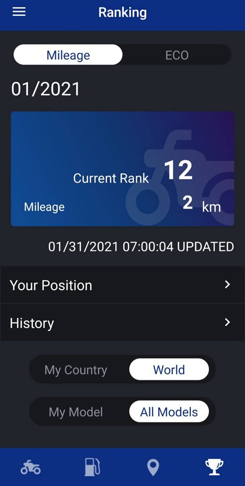 ฟังก์ชั่นนี้จะแสดงการจัดอันดับในการขับขี่เปรียบเทียบกับผู้ขับขี่ยามาฮ่าทั่วโลกในรุ่นที่มี Y-Connect โดยที่เจ้าของรถสามารถเลือกดูได้ทั้งในโหมดระยะทางการขับขี่ และอัตราการประหยัดน้ำมันเชื้อเพลิง เพื่อดูอันดับของตัวเองเปรียบเทียบกับคนอื่น โดยสามารถเลือกเปรียบเทียบได้ทั้งในประเทศหรือทั่วโลก