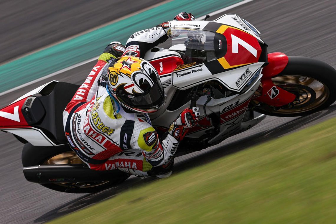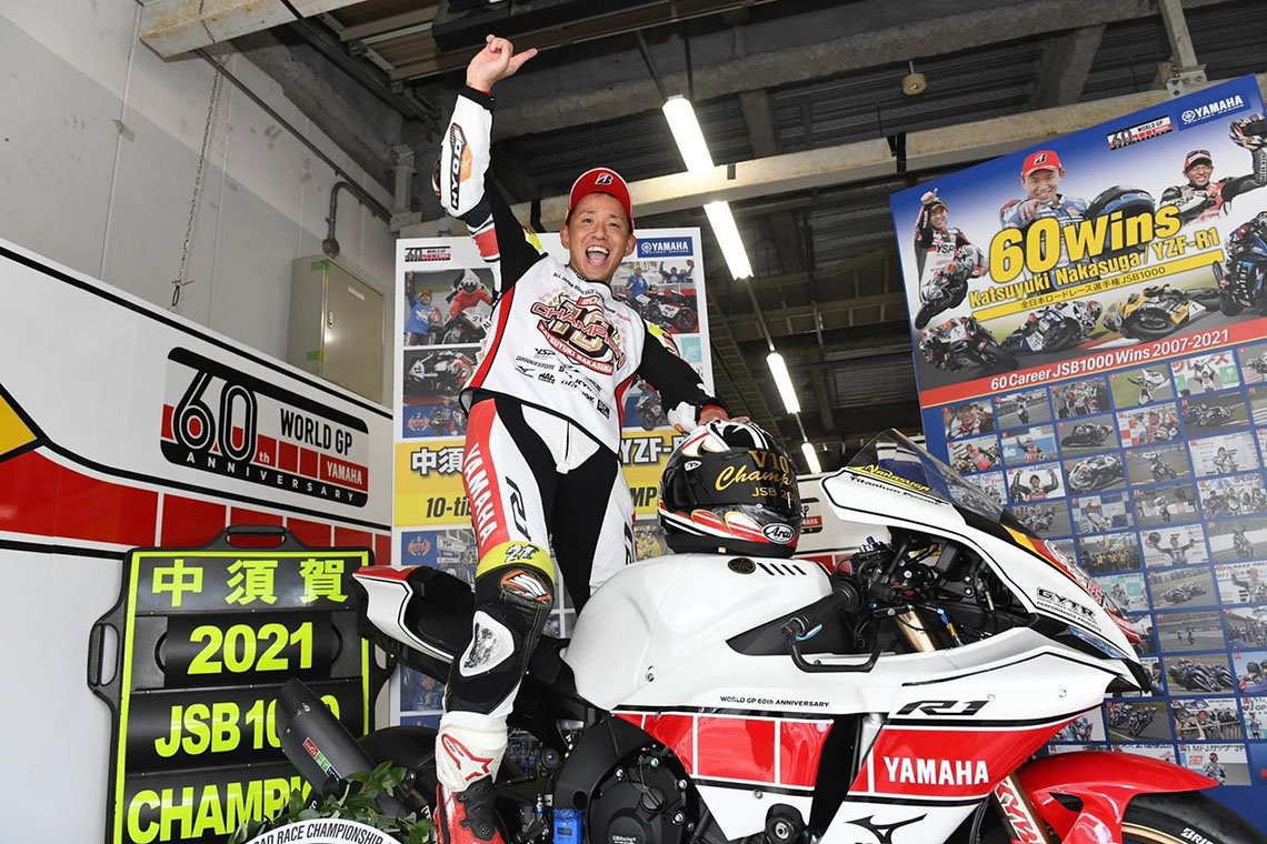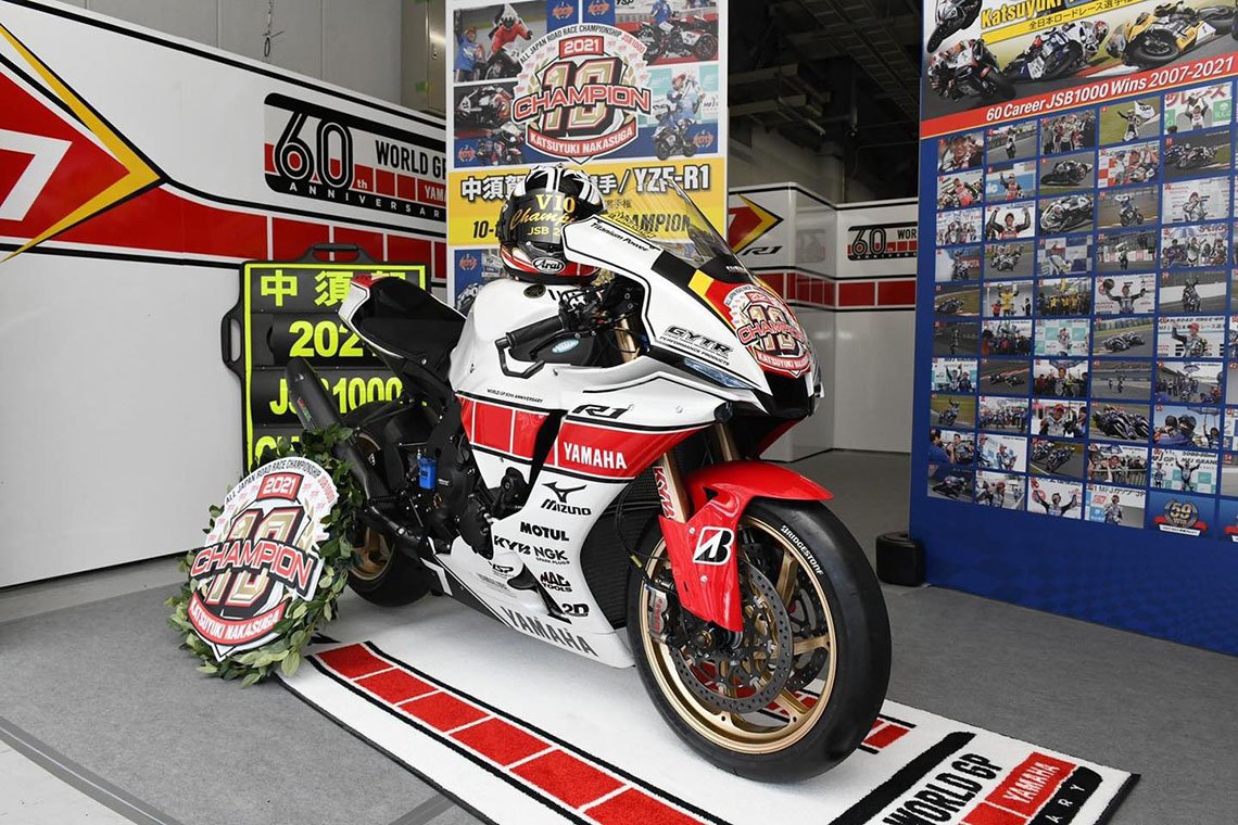 คัตซึยูกิ นากาซึกะ #7 ดาวบิดจอมเก๋าสังกัดยามาฮ่า แฟคทรี่ เรซซิ่ง ทีม ควบรถแข่ง R1 ลวดลายพิเศษเฉลิมฉลองปีที่ 60 ของยามาฮ่า บนเวทีเวิลด์กรังด์ปรีซ์ เหมาแชมป์ เจเอสบี 1000 จากการชิงชัยในสนามล่าสุดที่ ซูซูกะ คว้าชัยที่ 60 เกมรุ่นใหญ่ ผงาดขึ้นครองบัลลังก์แชมป์สมัยที่ 10