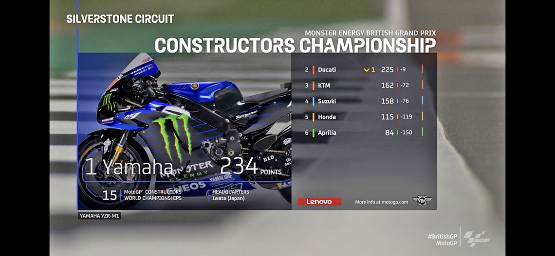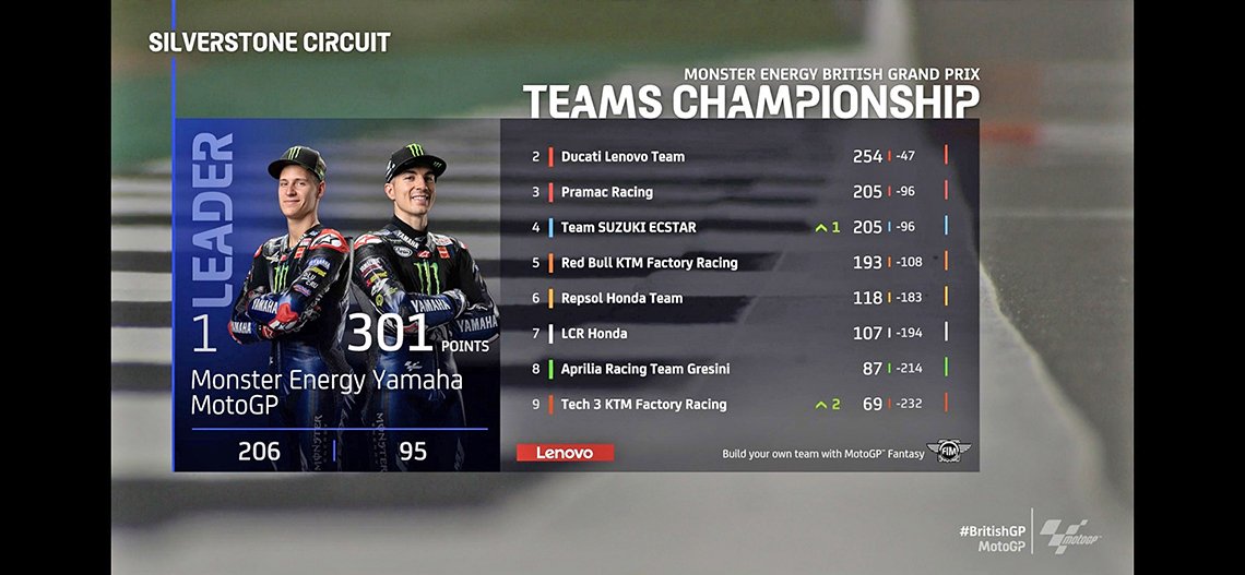 รวมถึง ยามาฮ่า และ มอนสเตอร์ เอเนอร์จี้ ยามาฮ่า โมโตจีพี ที่แท็กทีมครองจ่าฝูงบนตารางแชมเปี้ยนชิพด้วยเช่นกัน