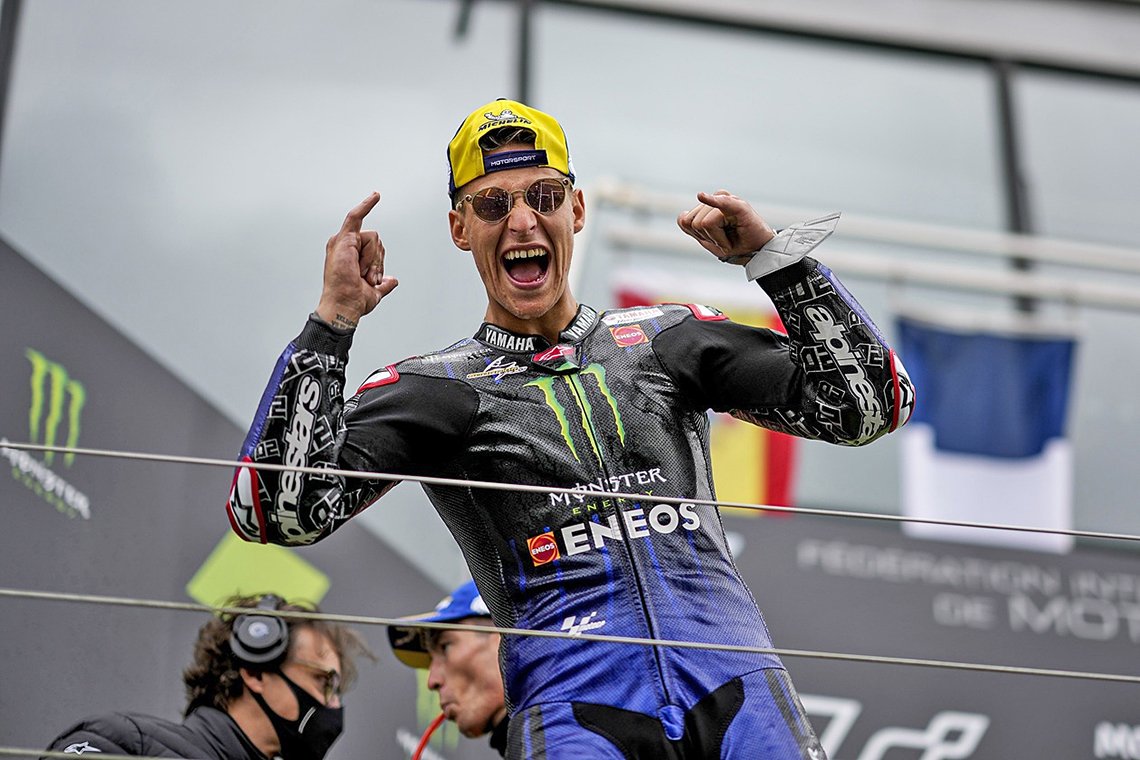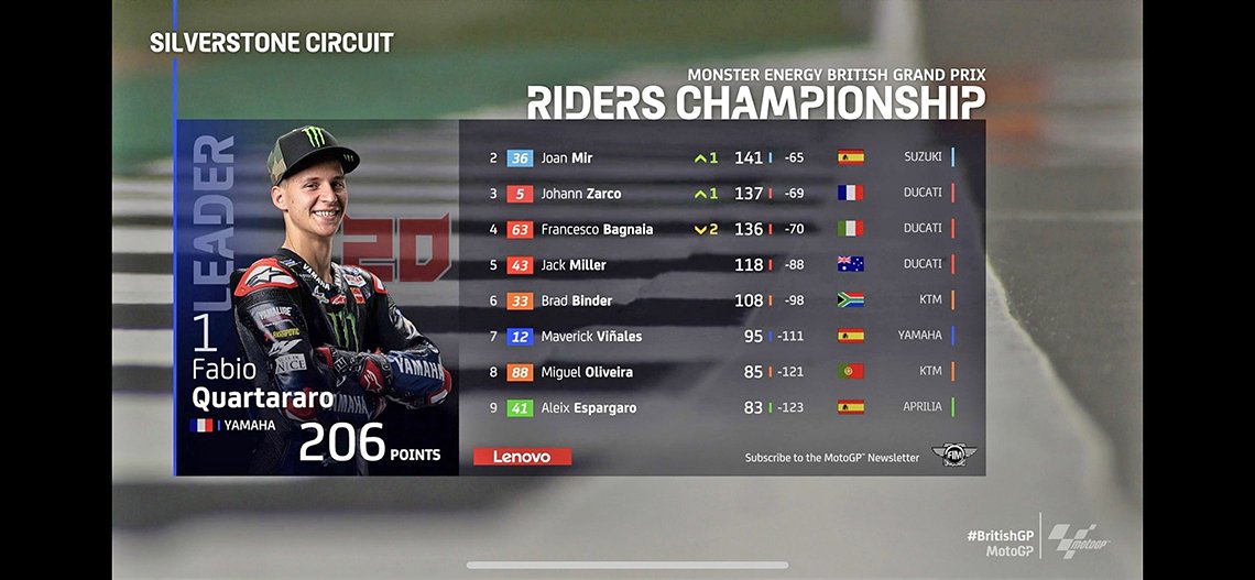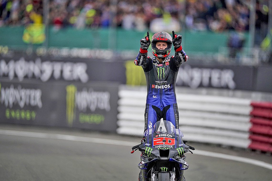 ฟาบิโอ กวาร์ตาราโร่ #20 ดาวบิดเฟรนช์แมน จาก มอนสเตอร์ เอเนอร์จี้ ยามาฮ่า โมโตจีพี ระเบิดฟอร์มเก่ง ควบรถแข่งยามาฮ่า YZR-M1 ผงาดคว้าชัยในสนาม 12 ศึกโมโตจีพี ที่ ซิลเวอร์สโตน เก็บแต้มนำโด่งบนตารางแชมเปี้ยนชิพ ทิ้งห่างคู่แข่งถึง 65 คะแนน
