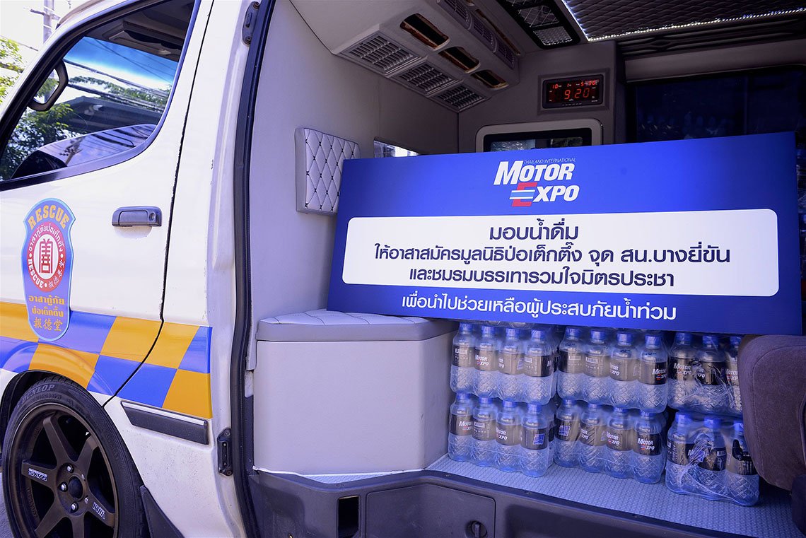 ผู้บริหาร บริษัท สื่อสากล จำกัด ผู้จัดงาน “มหกรรมยานยนต์” หรือ “Thailand International Motor Expo” ส่งมอบน้ำดื่ม 3,600 ขวดให้อาสาสมัครมูลนิธิป่อเต็กตึ๊ง จุด สน.บางยี่ขัน และชมรมบรรเทารวมใจมิตรประชา เพื่อนำไปช่วยเหลือผู้ประสบภัยน้ำท่วม เมื่อวันที่ 1 ตุลาคม 2564 ที่ผ่านมา