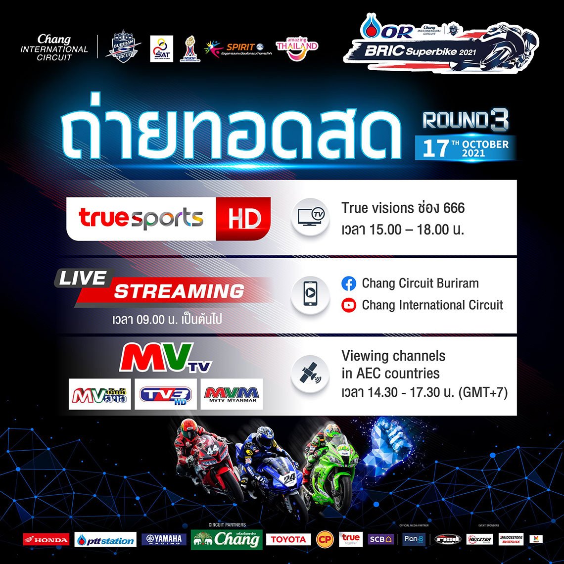 สำหรับการแข่งขันในสนามที่ 3 จะจับเวลารอบควอลิฟายเพื่อจัดอันดับสตาร์ทในวันเสาร์ที่ 16 ตุลาคมและดวลความเร็วรอบชิงชนะเลิศในวันอาทิตย์ที่ 17 ตุลาคม ถ่ายทอดสดทาง True Sport HD / True visions ช่อง 666 เวลา 15.00-18.00 น. หรือชม Live Streaming ทางเพจ facebook.com/ChangCircuitOfficial และ https://www.youtube.com/user/bricchannel ตั้งแต่ 09.00 น. เป็นต้นไป รวมทั้งถ่ายทอดสดไปยัง 3 ประเทศเพื่อนบ้าน สปป.ลาว เมียนมาร์ และกัมพูชา