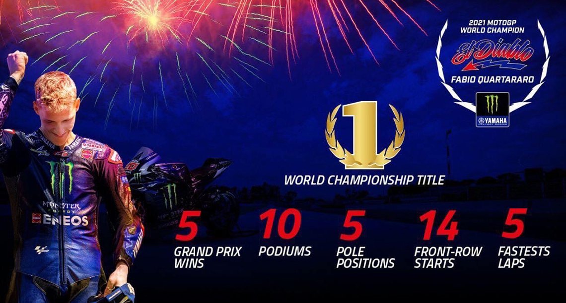 ผ่านเกมในสนามที่ 16 ฟาบิโอ กวาร์ตาราโร่ คว้าแชมป์โลกประเภทนักขับไปครอง หลังเก็บไปได้ทั้งสิ้น 267 คะแนน ทิ้งห่างอันดับ 2 ถึง 65 คะแนน ขณะเหลือการแข่งขันเพียง 2 สนามในฤดูกาลนี้ ขณะที่ มอนสเตอร์ เอเนอร์จี้ ยามาฮ่า โมโตจีพี ยังคงรั้งจ่าฝูงในประเภททีมผู้สร้าง เก็บไปได้ 364 คะแนน ถือแต้มเหนืออันดับ 2 อยู่ 13 คะแนน