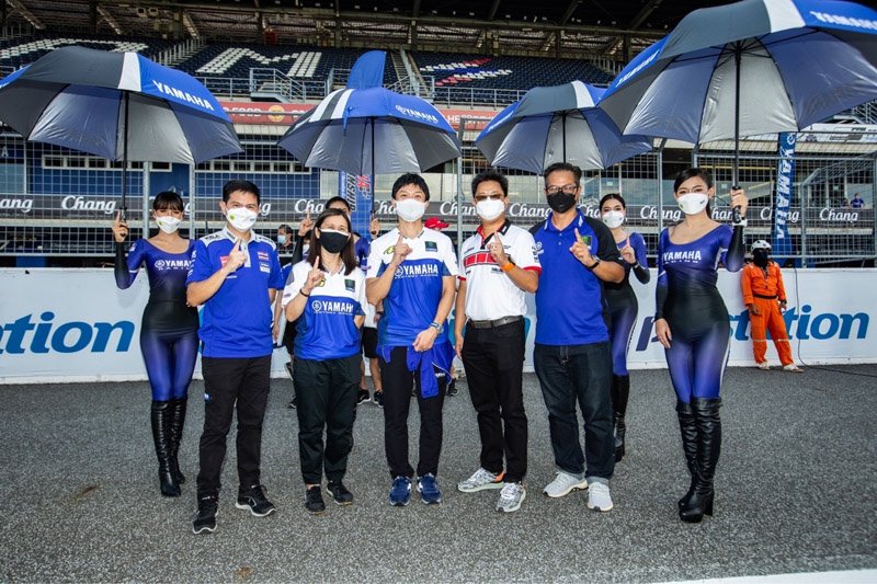มร.ทากาอากิ ฮิรามะ ที่ปรึกษาด้านบริหารการค้า นางสาวบัวทิพย์ จันทร์ดำรงกุล ผู้จัดการใหญ่ด้านวางแผนการค้า พร้อมด้วยคณะผู้บริหารระดับสูง บริษัท ไทยยามาฮ่ามอเตอร์ จำกัด ถ่ายภาพร่วมกันในพิธีเปิดกิจกรรม YAMAHA CHAMPIONSHIP 2021 โดยยามาฮ่ายกพลระเบิดความมันส์สนามแรก ณ สนามช้าง อินเตอร์เนชั่นแนล เซอร์กิต จ.บุรีรัมย์ ภายใต้ 8 รุ่นการแข่งขัน เอาใจกลุ่มลูกค้าครบทุกพิกัดซีซี