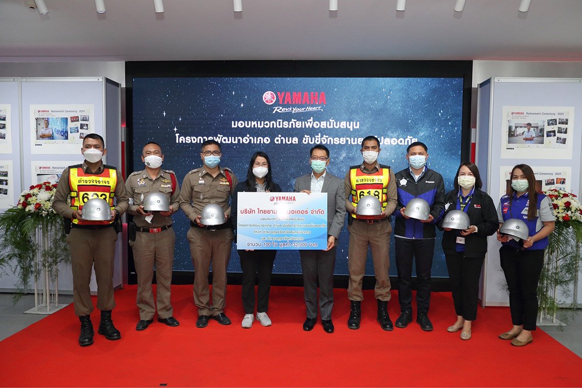 นายสมเกียรติ พูลขวัญ รองผู้จัดการใหญ่ด้านบริหาร บริษัท ไทยยามาฮ่ามอเตอร์ จำกัด มอบหมวกนิรภัย จำนวน 100 ใบ มูลค่า 32,000 บาท ในโครงการพัฒนา อำเภอ ตำบล ขับขี่รถจักรยานยนต์ปลอดภัย ให้กับ สถานีตำรวจภูธรจังหวัดสมุทรปราการ และสถานีตำรวจภูธรจังหวัดตราด โดยมี พ.ต.ท.ทรงพล แสงไพโรจน์ (คนที่ 3 จากซ้าย) สารวัตรจราจร สภ.บางเสาธง และดร.ดนุลดา จามจุรี (คนที่ 4 จากซ้าย) หัวหน้า สอจร.ภาคตะวันออก เป็นผู้รับมอบ เพื่อใช้ในการส่งเสริมความปลอดภัยในช่วงเทศกาลปีใหม่ และประชาสัมพันธ์โครงการสวมหมวกนิรภัย 100% ในช่วงเทศกาลปีใหม่ 2565 โดยมีวัตถุประสงค์เพื่อลดความสูญเสียจากการเกิดอุบัติเหตุจราจรบนท้องถนน และเสริมสร้างวินัยจราจรในการสวมหมวกนิรภัย