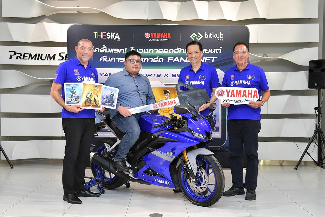 นายพงศธร เอื้อมงคลชัย รองประธานกรรมการบริหาร พร้อมคณะผู้บริหารระดับสูง บริษัท ไทยยามาฮ่ามอเตอร์ จำกัด พร้อมด้วย นายจิรายุส ทรัพย์ศรีโสภา ผู้ก่อตั้งและประธาน บริษัท บิทคับ บล็อคเชน เทคโนโลยี จำกัด นายภาสกร ปานนอก ประธานกรรมการบริหาร บริษัท บิทคับ บล็อคเชน เทคโนโลยี จำกัด และนายกฤษณ์ บุญญะ (บี้เดอะสกา) อินฟลูเอ็นเซอร์ชื่อดังของประเทศไทย ถ่ายภาพร่วมกันในการมอบรางวัลรถจักรยานยนต์ YAMAHA YZF-R15 มูลค่า 97,500 บาท ให้กับ นายปิยะกานตร์ นิมมากุลวิรัตน์ ผู้โชคดีที่สามารถสะสมการ์ด FAN NFT YAMAHA SPORTS X BIE THE SKA FANS NFT COLLECTION สุดเท่ ได้รวมทั้งสิ้น 15 ใบ ผ่านการสะสมจาก Airdrop และการเปิดกาชาปอง ระหว่างวันที่ 19 พฤศจิกายน 2564 - วันที่ 17 ธันวาคม 2564 บน Website Bitkub NFT พร้อมกันนี้ยามาฮ่ายังได้ร่วมมอบรางวัลอื่นๆ รวมมูลค่ามากกว่า 700,000 บาท