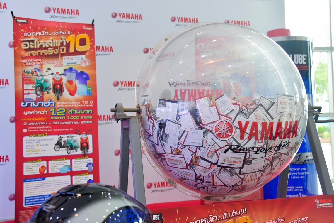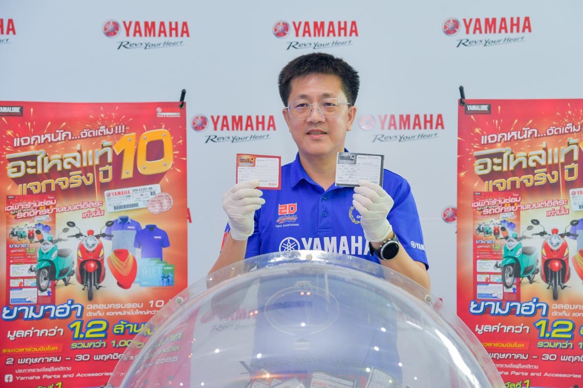นายมิตรชัย คงกิตติกุล ผู้จัดการทั่วไปฝ่ายอะไหล่ พร้อมด้วยคณะผู้บริหาร บริษัท ไทยยามาฮ่ามอเตอร์ จำกัด ร่วมกันจับรางวัลผู้โชคดีจากแคมเปญ “อะไหล่แท้ แจกจริง ปีที่ 10” ครั้งที่ 1 ให้กับร้านซ่อมรถจักรยานยนต์อิสระที่ใช้สินค้า น้ำมันเครื่องยามาลู้ป, อุปกรณ์ตกแต่ง รวมถึงอะไหล่ของแท้จากยามาฮ่า ลุ้นรางวัลรถจักรยานยนต์ยามาฮ่า FINO จำนวน 3 คัน, สร้อยคอทองคำหนัก 2 สลึง จำนวน 30 รางวัล, บัตรของขวัญ โลตัส, เสื้อช็อปช่างยามาลู้ป, เสื้อโปโลยามาลู้ป รวมของรางวัลตลอดรายการ จำนวน 1,053 รางวัล มูลค่ากว่า 1.2 ล้านบาท