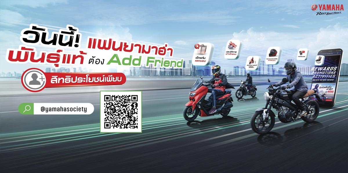 Line Official Account “YAMAHA Society TH” ช่องทางการสื่อสารใหม่ของยามาฮ่า ให้ลูกค้ายามาฮ่า และผู้ที่สนใจ สามารถสื่อสารกับยามาฮ่าได้รวดเร็วมากขึ้น พร้อมตอบโจทย์ความต้องการที่หลากหลายของลูกค้า โดยสามารถลงทะเบียน Line Official Account “YAMAHA Society TH” ได้ผ่านทาง Application LINE และ Add Friend ได้แล้ววันนี้ที่ https://lin.ee/zyrSmCs