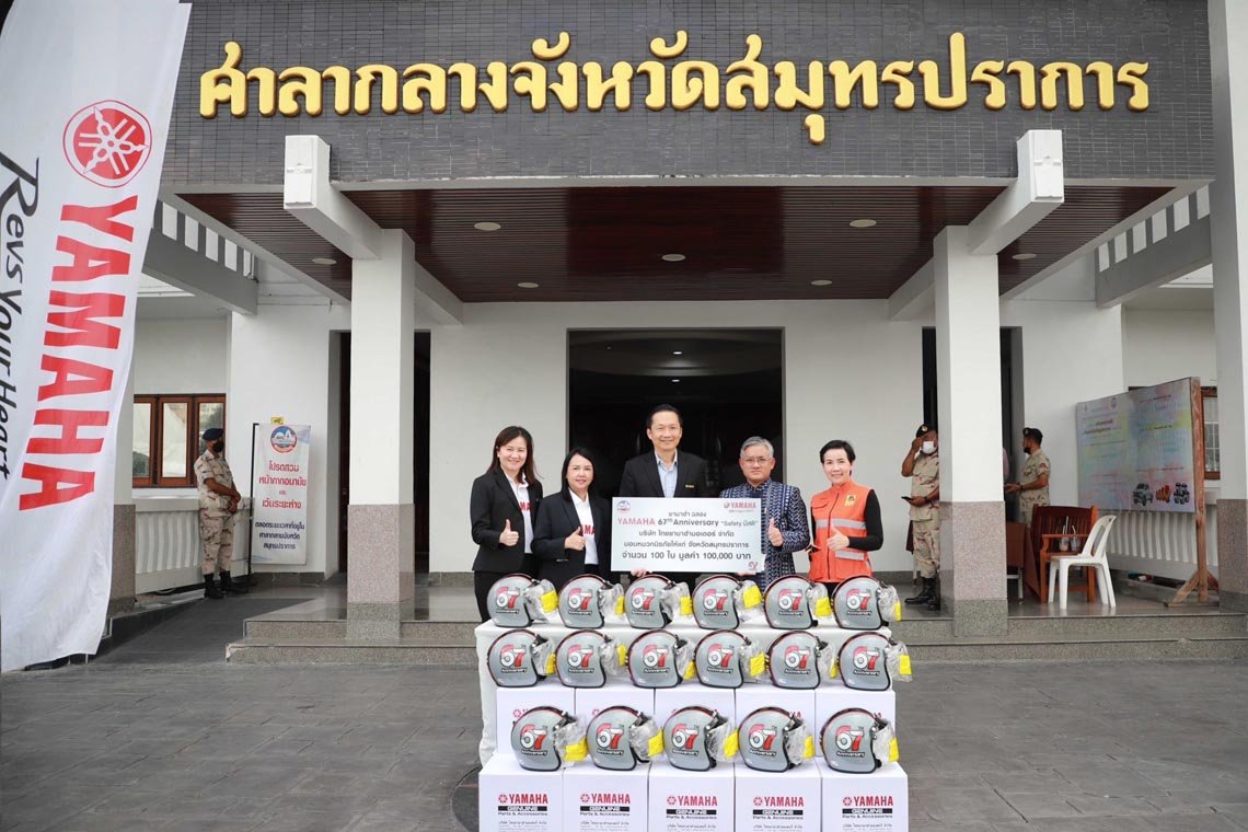 นายพงศธร เอื้อมงคลชัย รองประธานกรรมการบริหาร พร้อมผู้บริหารระดับสูง บริษัท ไทยยามาฮ่ามอเตอร์ จำกัด ถ่ายภาพร่วมกับ นายชัยพจน์ จรูญพงศ์ รองผู้ว่าราชการจังหวัด ปฏิบัติราชการแทนผู้ว่าราชการจังหวัดสมุทรปราการ ในพิธีมอบหมวกนิรภัยจำนวน 100 ใบ เพื่อนำไปแจกจ่ายให้กับประชาชนในจังหวัดสมุทรปราการ เป็นการร่วมรณรงค์ให้ผู้ขับขี่สวมหมวกนิรภัยทุกครั้งในการใช้รถจักรยานยนต์ เพื่อเป็นการป้องกันและลดการสูญเสียเมื่อเกิดอุบัติเหตุจากท้องถนน พร้อมสร้างจิตสำนึกถึงความปลอดภัย และเสริมสร้างวินัยจราจร