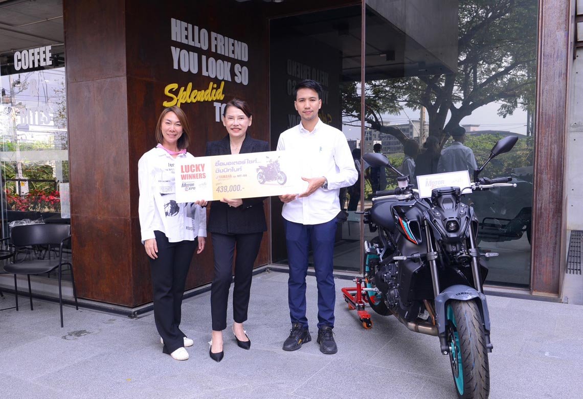 ชไมพร ปภัสร์พงษ์ ผู้ควบคุมงานด้านการตลาดสัมพันธ์ และวราทิพย์ คำนึงคุณ กรรมการผู้จัดการ บริษัท มอเตอร์ไซเคิล เอ็กซ์โป จำกัด มอบรางวัลรายการ “ซื้อมอเตอร์ไซค์...ชิงบิกไบค์” YAMAHA รุ่น MT-09 ราคา 439,000 บาท ผู้ได้รับรางวัล ได้แก่ กวี จันทร์คง จ. สมุทรปราการ