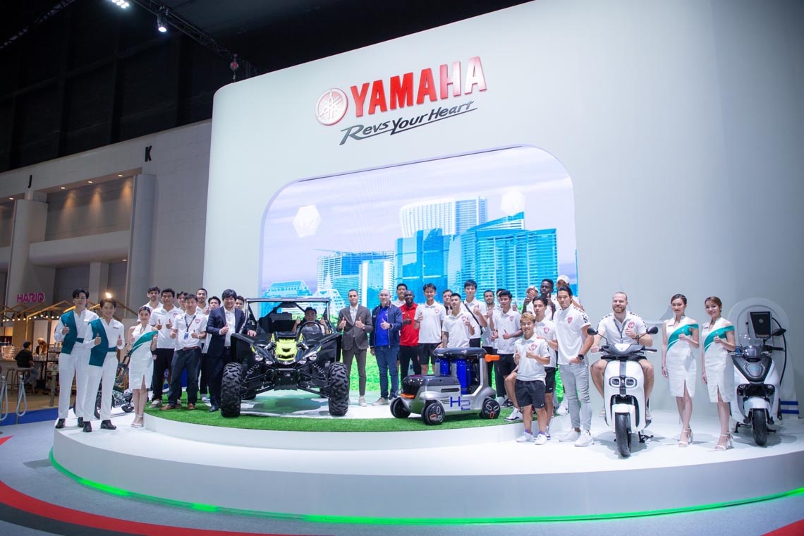 นายพลัฏฐ์ ประวีร์ชานนท์ ผู้จัดการทั่วไปฝ่ายการตลาดกลุ่มรถสปอร์ตและกลุ่มรถครอบครัว บริษัท ไทยยามาฮ่ามอเตอร์ จำกัด ให้การต้อนรับและถ่ายภาพร่วมกับ นายรณฤทธิ์ ซื่อวาจา ผู้อำนวยการสโมสรฟุตบอลเมืองทอง ยูไนเต็ด พร้อมด้วย มร.มาริโอ ยูรอฟสกี้ ผู้จัดการทีมฟุตบอล และทัพนักเตะสโมสร เมืองทองยูไนเต็ด ในการเดินทางมาเยี่ยมชมนวัตกรรมสุดล้ำ และรถจักรยานยนต์ยามาฮ่า ภายในงานบางกอก อินเตอร์เนชั่นแนล มอเตอร์โชว์ ครั้งที่ 44