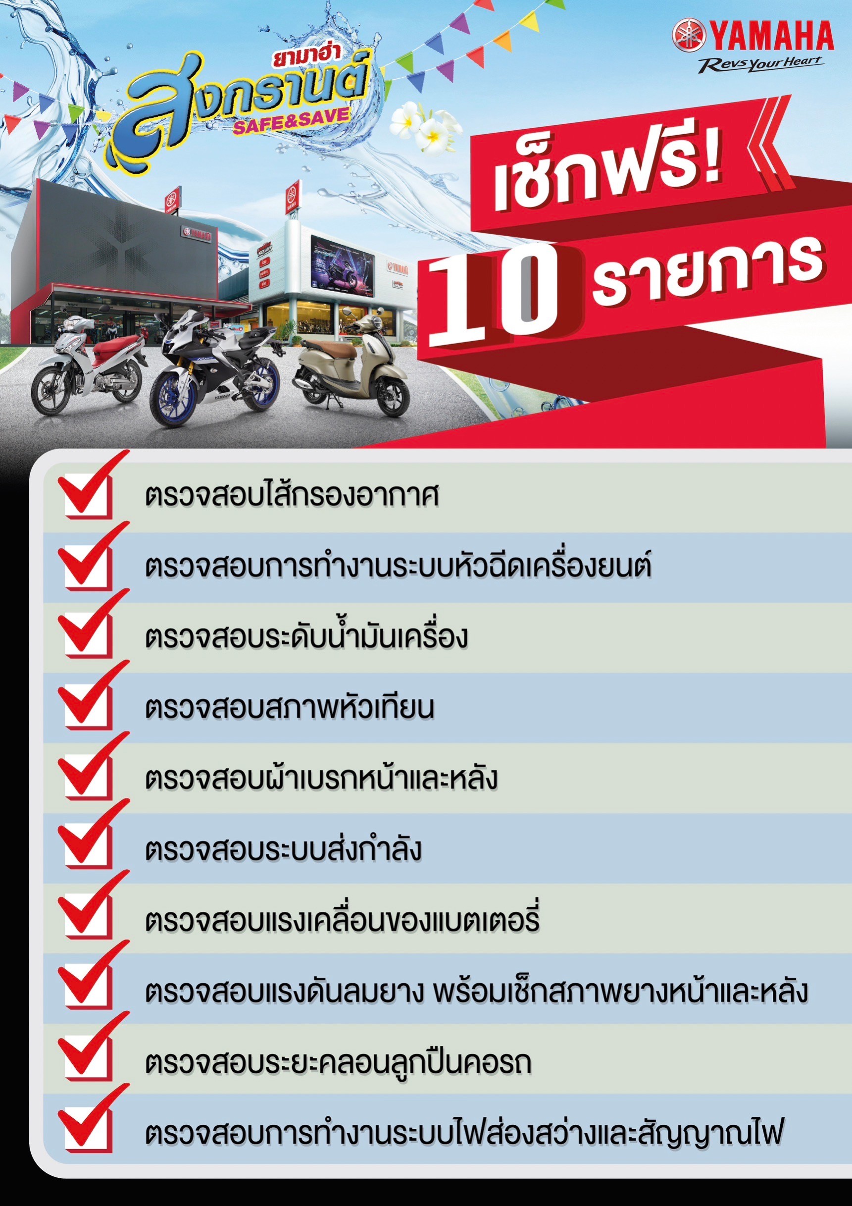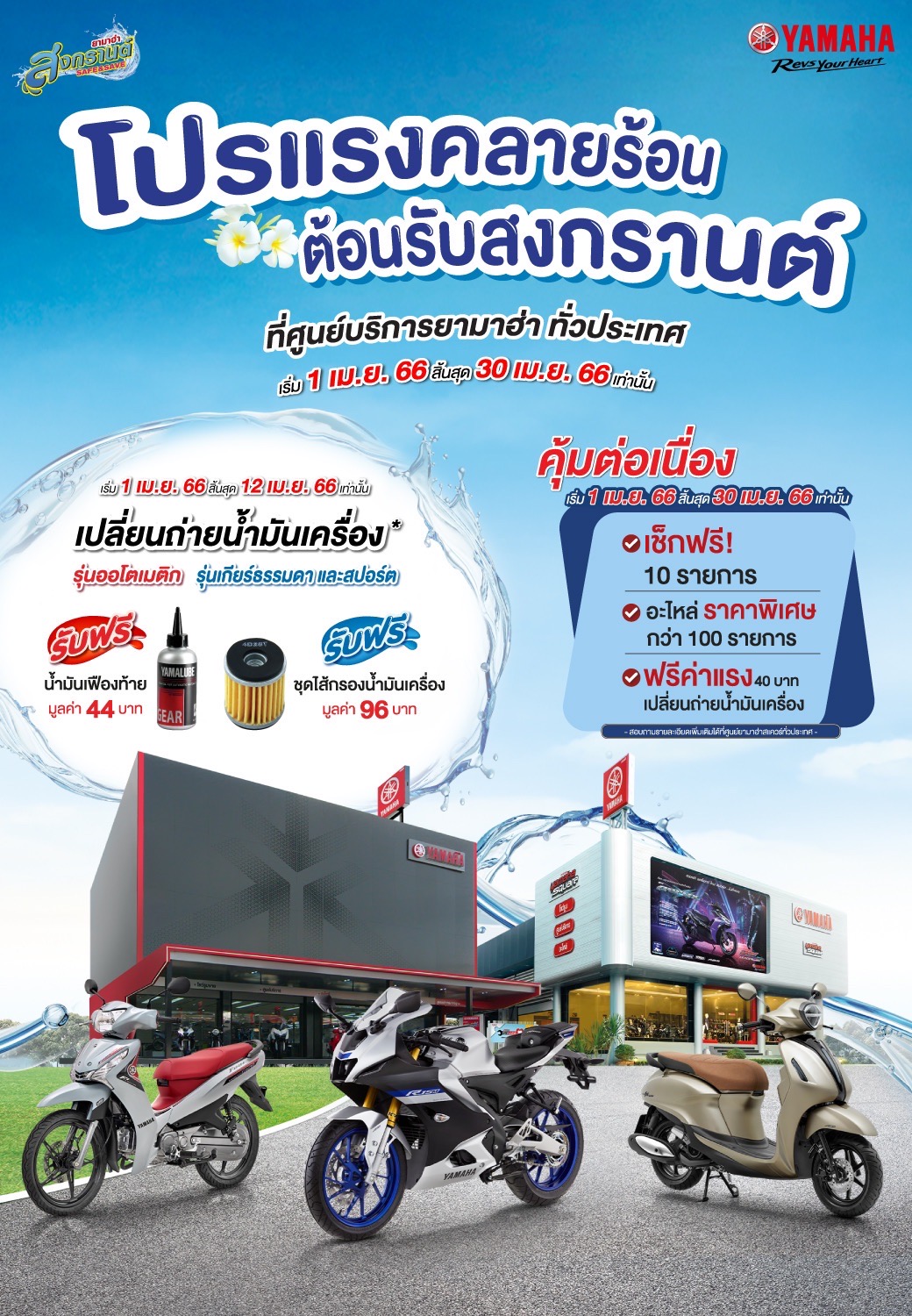 บริษัท ไทยยามาฮ่ามอเตอร์ จำกัด ผู้ผลิตและจำหน่ายรถจักรยานยนต์ยามาฮ่าจัดแคมเปญ “Songkran Safe & Save 2566” ต้อนรับวันสงกรานต์ เพื่อให้สอดคล้องกับมาตราการความปลอดภัยบนท้องถนนร่วมกับกรมการขนส่งทางบก โดยจัดแคมเปญ “ตรวจรถก่อนใช้เดินทางปลอดภัย” สำหรับลูกกค้ารถจักรยานยนต์ยามาฮ่าทุกรุ่นที่ขนาดเครื่องยนต์ไม่เกิน 500 ซีซี ระหว่างวันที่ 1 – 12 เมษายน 2566 โดยลูกค้าที่นำรถจักรยานยนต์ยามาฮ่ามาเปลี่ยนถ่ายน้ำมันเครื่องรถออโตเมติก รับฟรี! น้ำมันเฟืองท้าย หรือเปลี่ยนถ่ายน้ำมันเครื่องรถสปอร์ตหรือรถครอบครัว รับฟรี! ไส้กรองน้ำมันเครื่อง พร้อมฟรีค่าแรงเปลี่ยนถ่ายน้ำมันเครื่อง และโปรโมชั่นสุดพิเศษระหว่างวันที่ 1 – 30 เมษายน 2566 ฟรีค่าแรงเปลี่ยนถ่ายน้ำมันเครื่อง พร้อมตรวจเช็คฟรี 10 รายการ อีกทั้งยังสามารถซื้อสินค้าราคาพิเศษกว่า 100 รายการ โดยสามารถเข้ารับบริการได้ ณ ร้านผู้จำหน่ายรถจักรยานยนต์ยามาฮ่าทั่วประเทศ