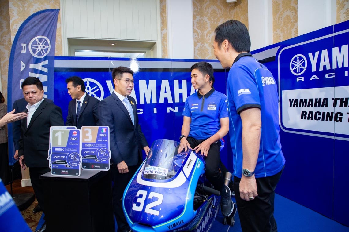นายพงศธร เอื้อมงคลชัย รองประธานกรรมการบริหาร นายวีรพงษ์ ธนากิจจานนท์ ผู้จัดการทั่วไปฝ่ายกีฬายานยนต์ และสถาบันฝึกอบรมขับขี่รถจักรยานยนต์ยามาฮ่า นายพลัฏฐ์ ประวีร์ชานนท์ ผู้จัดการทั่วไปฝ่ายการตลาดกลุ่มรถสปอร์ตและกลุ่มรถครอบครัว บริษัท ไทยยามาฮ่ามอเตอร์ จำกัด พร้อมด้วย “ไอเดีย” กฤตภัทร เขื่อนคำ นักบิดดาวรุ่งสังกัดยามาฮ่า ถ่ายภาพร่วมกับ นายณณัฏฐ์ หงษ์ชูเวช ที่ปรึกษารัฐมนตรีว่าการกระทรวงการท่องเที่ยวและกีฬา นายนฤชา โฆษาศิวิไลซ์ ผู้ว่าราชการจังหวัดบุรีรัมย์ นายตนัยศิริ ชาญวิทยารมณ์ กรรมการผู้อำนวยการ สนามช้างฯ ในงานแถลงข่าวนับถอยหลังสู่การแข่งขันโมโตจีพี รายการโออาร์ ไทยแลนด์ กรังด์ปรีซ์ 2023