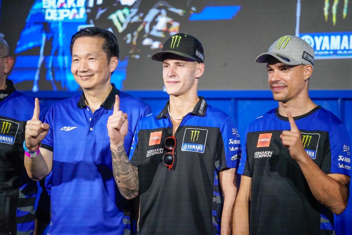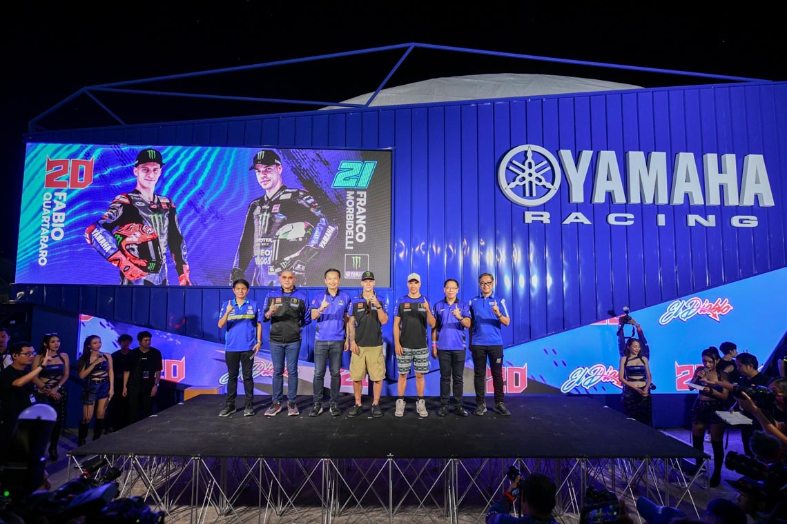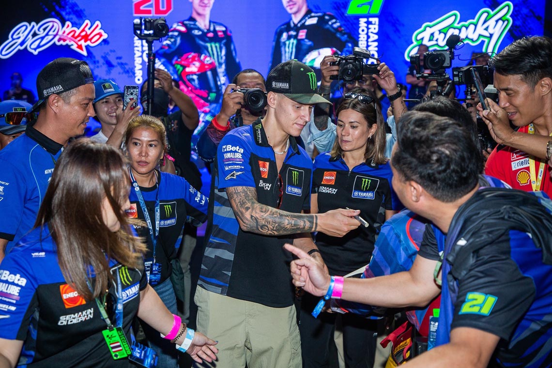 นายพงศธร เอื้อมงคลชัย รองประธานกรรมการบริหาร พร้อมด้วยผู้บริหารระดับสูง บริษัท ไทยยามาฮ่ามอเตอร์ จำกัด ให้การต้อนรับ เอลดิอาโบล ฟาบิโอ กวาร์ตาราโร #20 และนายพลแฟรงค์กี้ ฟรังโก มอร์บิเดลลี #21 นักแข่งชั้นนำของโลกสังกัด มอนสเตอร์ อีเนอร์จี้ ยามาฮ่า โมโตจีพีทีม ในกิจกรรม มีทแอนด์กรี๊ด ที่ยามาฮ่าจัดขึ้นให้กับแฟนๆ กีฬามอเตอร์สปอร์ตชาวไทยอย่างใกล้ชิด ที่บูธ YamahaGP Pavilion