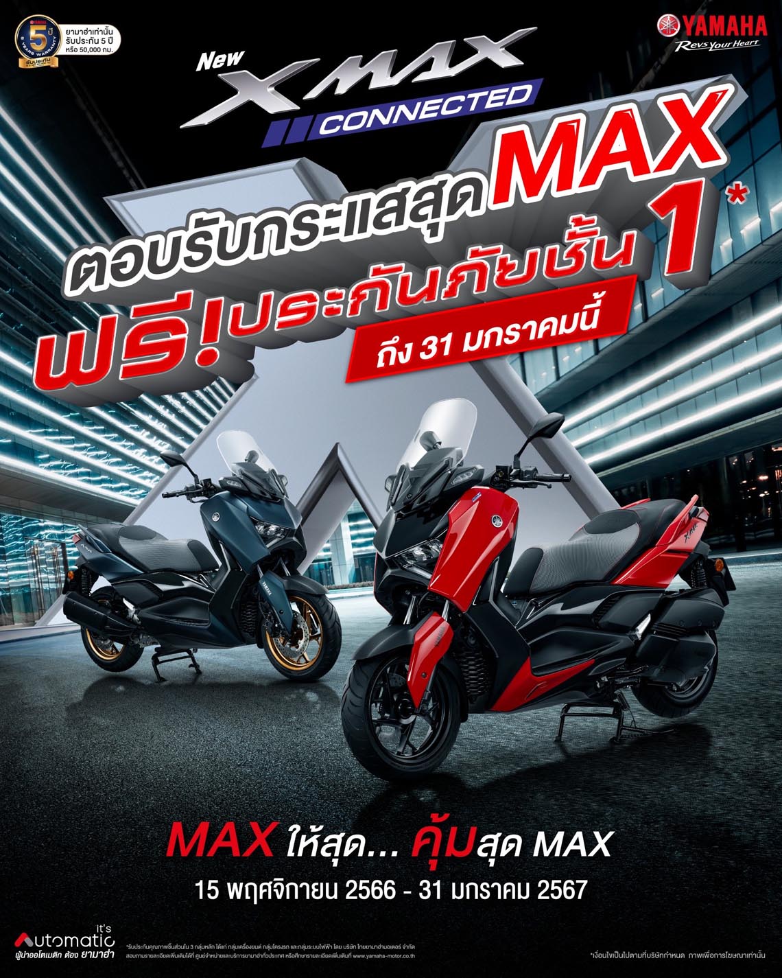 บริษัท ไทยยามาฮ่ามอเตอร์ จำกัด ผู้ผลิตและจำหน่ายรถจักรยานยนต์ยามาฮ่าในประเทศไทย จัดเต็มแม็กซ์ตามเสียงเรียกร้อง ขยายเวลาโปรโมชัน MAX ให้สุด...คุ้มสุด MAX แถมฟรี ประกันภัยชั้น 1 เมื่อซื้อ รถ YAMAHA XMAX Connected ระหว่างวันที่ 15 พฤศจิกายน 2566 ถึงวันที่ 31 มกราคม 2567 นี้ เพิ่มความมั่นใจอุ่นใจยามขับขี่ พร้อมการรับประกันนานถึง 5 ปี หรือ 50,000 กม.