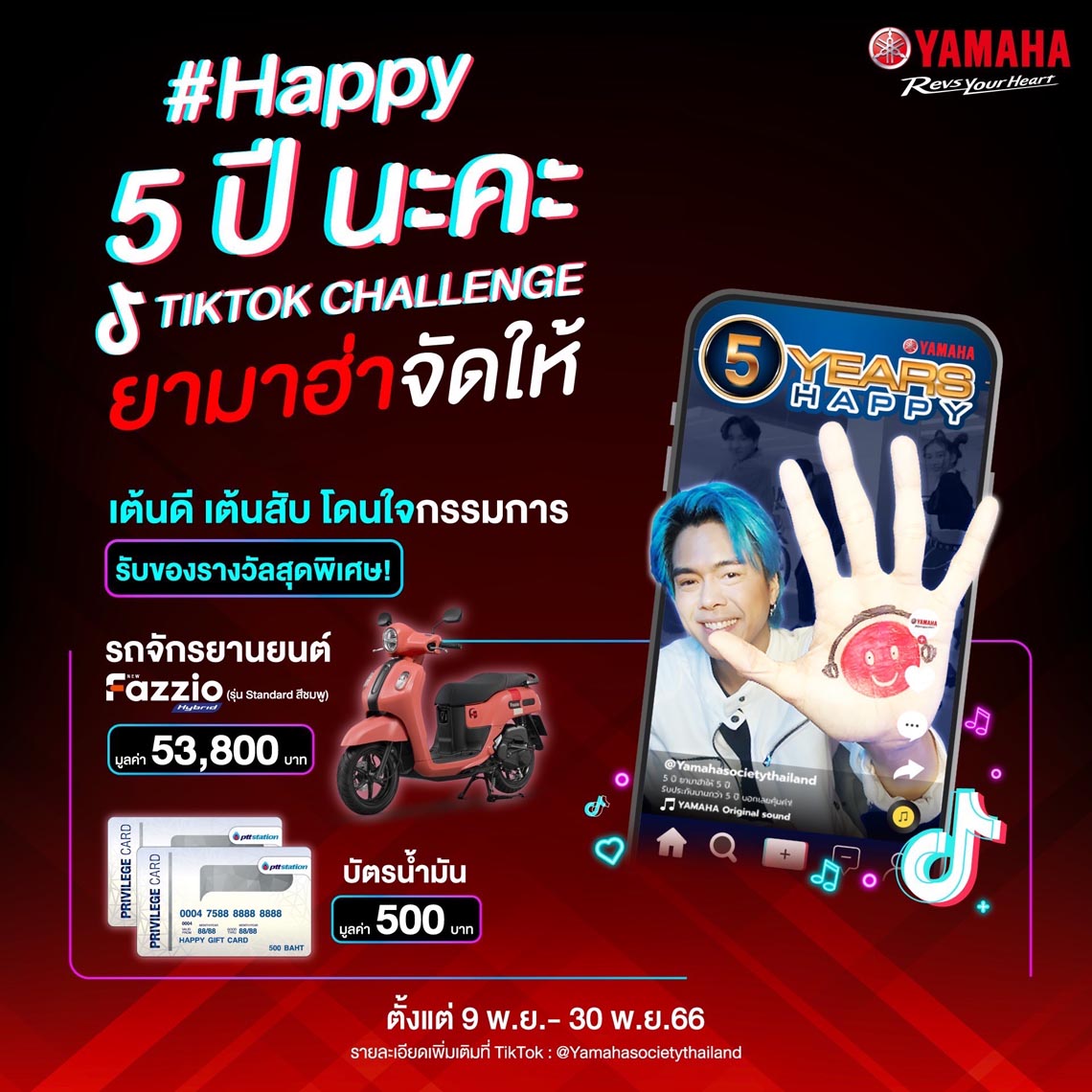 นายจิรภัทร สายเพชร ผู้จัดการทั่วไปฝ่ายการตลาดกลุ่มรถออโตเมติก และสนับสนุนการตลาด บริษัท ไทยยามาฮ่ามอเตอร์ จำกัด มอบรางวัลรถจักรยานยนต์ YAMAHA FAZZIO มูลค่า 53,800 บาท ให้แก่ นายญฐ์ชญา ฟ้ากลาง ผู้โชคดีผ่านแคมเปญ Tiktok Challenge คลิปสุดแฮปปี้ เต้นดีเต้นถูกใจรับ YAMAHA FAZZIO จำนวน 1 รางวัล นอกจากนี้ยังมีรางวัลบัตรน้ำมันมูลค่า 500 บาท จำนวน 100 รางวัล รวมมูลค่ารางวัลรวมทั้งสิ้น 103,800 บาทโดยกิจกรรมนี้ได้จัดเพื่อเป็นการตอกย้ำ ประชาสัมพันธ์เพื่อสร้างการรับรู้ และตอกย้ำการรับประกัน 5 ปี หรือ 50,000 กิโลเมตร ในรถจักรยานยนต์ยามาฮ่า ที่มีขนาดเครื่องยนต์ไม่เกิน 400 ซีซี ทุกรุ่น โดยแคมเปญนี้ได้มีขึ้นระหว่างวันที่ 9 – 30 พฤศจิกายน 2566 ที่ผ่านมา ผ่านช่องทาง Tiktok ซึ่งมีผู้ร่วมสนุกและส่งผลงานชาเล้นจ์ เข้ามาเป็นจำนวนมาก สำหรับผู้ที่สนใจร่วมกิจกรรม และลุ้นรางวัลจากยามาฮ่า สามารถติดตามความเคลื่อนไหวได้ที่ FACEBOOK : YAMAHA SOCIETY THAILAND และ TIKTOK : YAMAHA SOCIETY THAILAND