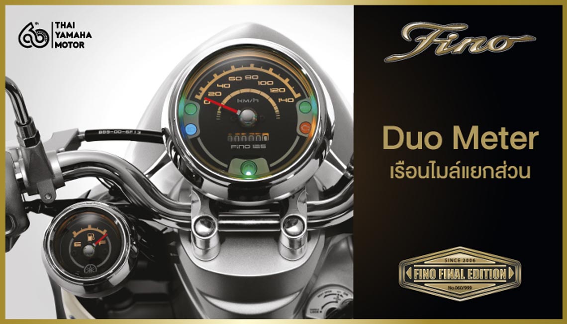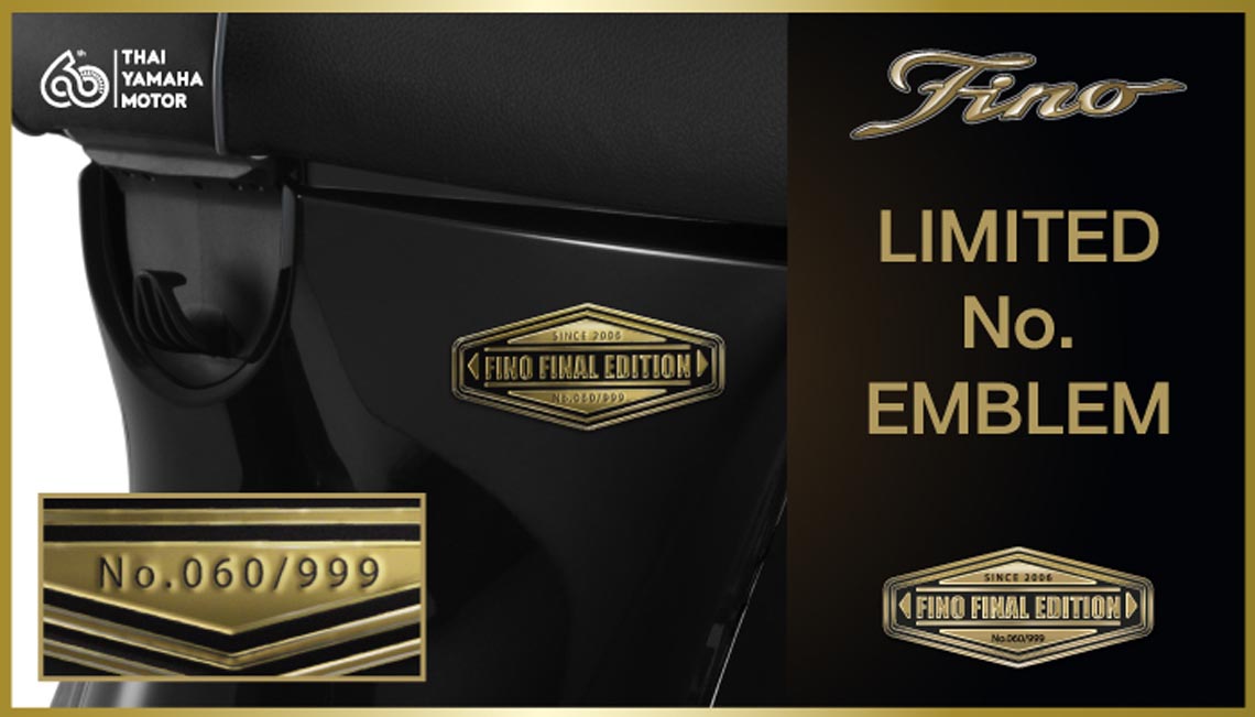 บริษัท ไทยยามาฮ่ามอเตอร์ จำกัด ฉลองครบรอบ 60 ปี ที่ยืนหยัดในการผลิตสินค้าคุณภาพ และอยู่คู่กับคนไทย ด้วยการส่งรถจักรยานยนต์ออโตเมติกโมเดลระดับตำนานอย่าง “ฟีโน่” ออกวางจำหน่ายในโอกาสสุดพิเศษนี้ นั่นคือ “YAMAHA FINO FINAL EDITION” ต้นกำเนิดแห่งรถออโตเมติกแฟชั่นจากยามาฮ่า ความคลาสสิกร่วมสมัยที่ครองใจคนไทยมา กว่า 18 ปี ที่ผลิตออกมาจำหน่ายในจำนวนจำกัดเพียง 999 คัน ทรงคุณค่าด้วยโลโก้ Emblem สีทอง และเพลทระบุหมายเลขจำกัดเฉพาะแต่ละคันที่ผลิต เพิ่มความพิเศษอีกระดับด้วยหมวกกันน็อกลายพิเศษ และมั่นใจในการรับประกันมากกว่า ถึง 5 ปี หรือ 50,000 กิโลเมตร