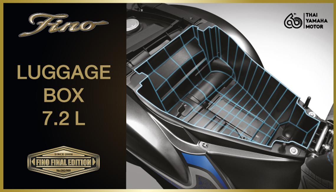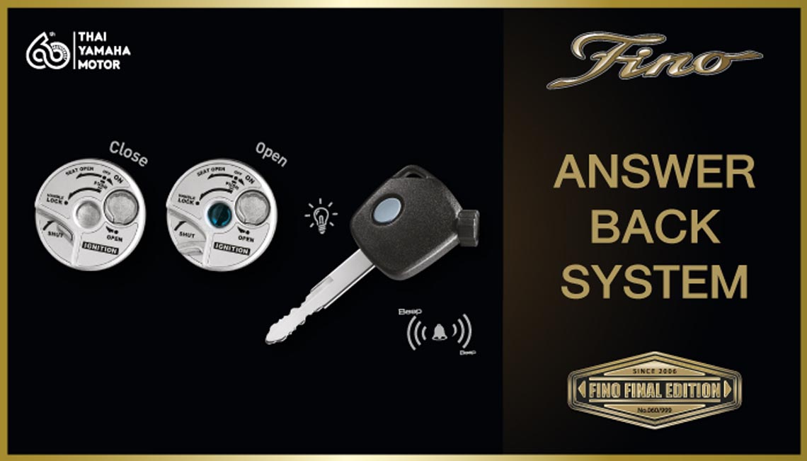 นอกจากนี้ “YAMAHA FINO FINAL EDITION” ยังมาพร้อมกุญแจแบบ ANSWER BACK SYSTEM ที่สามารถเปิดช่องกุญแจได้แบบอัตโนมัติ พร้อมไฟเรืองแสง และส่งสัญญาณบอกตำแหน่งรถช่วยให้มองหาตำแหน่งจอดรถได้ง่ายยิ่งขึ้น พร้อม LUGGAGE BOX 7.2L ที่เก็บของขนาด 7.2 ลิตร ที่สามารถเก็บหมวกกันน็อกครึ่งใบรวมถึงสัมภาระจำเป็นได้อย่างสบาย และปลอดภัยหายห่วง