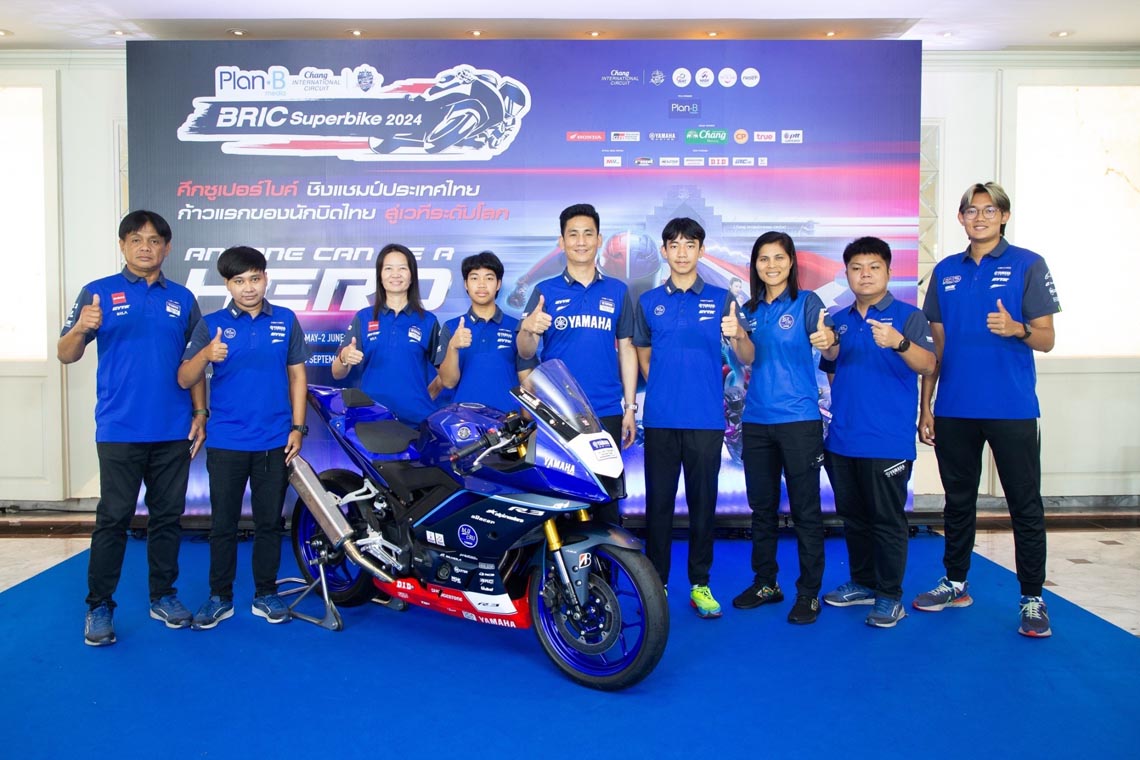 นายอุกฤษณ์ ภาควิวรรธ รองผู้จัดการใหญ่ ด้านวางแผนการค้า และการตลาด บริษัท ไทยยามาฮ่ามอเตอร์ จำกัด ถ่ายภาพร่วมกับนายณัฐพล อันตรเสน ผู้อำนวยการสำนักงานคณะกรรมการกีฬาอาชีพ การกีฬาแห่งประเทศไทย นายตนัยศิริ ชาญวิทยารมณ์ กรรมการผู้อำนวยการ สนามช้าง อินเตอร์เนชั่นแนล เซอร์กิต นายโชติชนก ชิดชอบ ผู้อำนวยการฝ่ายกิจกรรมต่างประเทศ บริษัท บุรีรัมย์ยูไนเต็ด อินเตอร์เนชั่นแนลเซอร์กิต จำกัด และนายไกรทส วงษ์สวรรค์ อุปนายกสมาคมกีฬาแข่งรถจักรยานยนต์แห่งประเทศไทย พร้อมกับ 2 นักแข่งดาวรุ่ง “เอฟ” พงศ์สถิต แสนหลวง และ “ฟูลมูน” พศิน ชมภูรัตน์ และนักแข่งแซทเทิลไลท์ของยามาฮ่า ดีกรีแชมป์ในปี 2023 ในการแถลงข่าวการแข่งขันรถจักรยานยนต์ทางเรียบชิงแชมป์ประเทศไทยรายการ PlanB Media BRIC SuperBike 2024