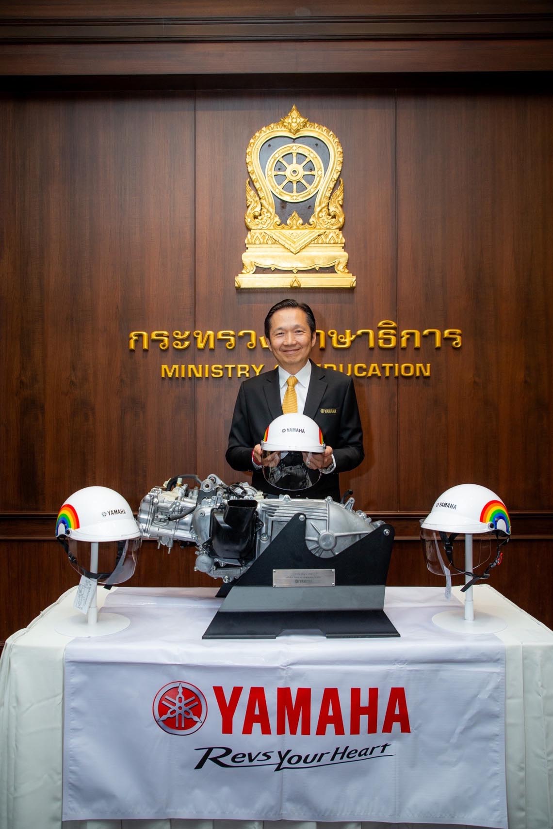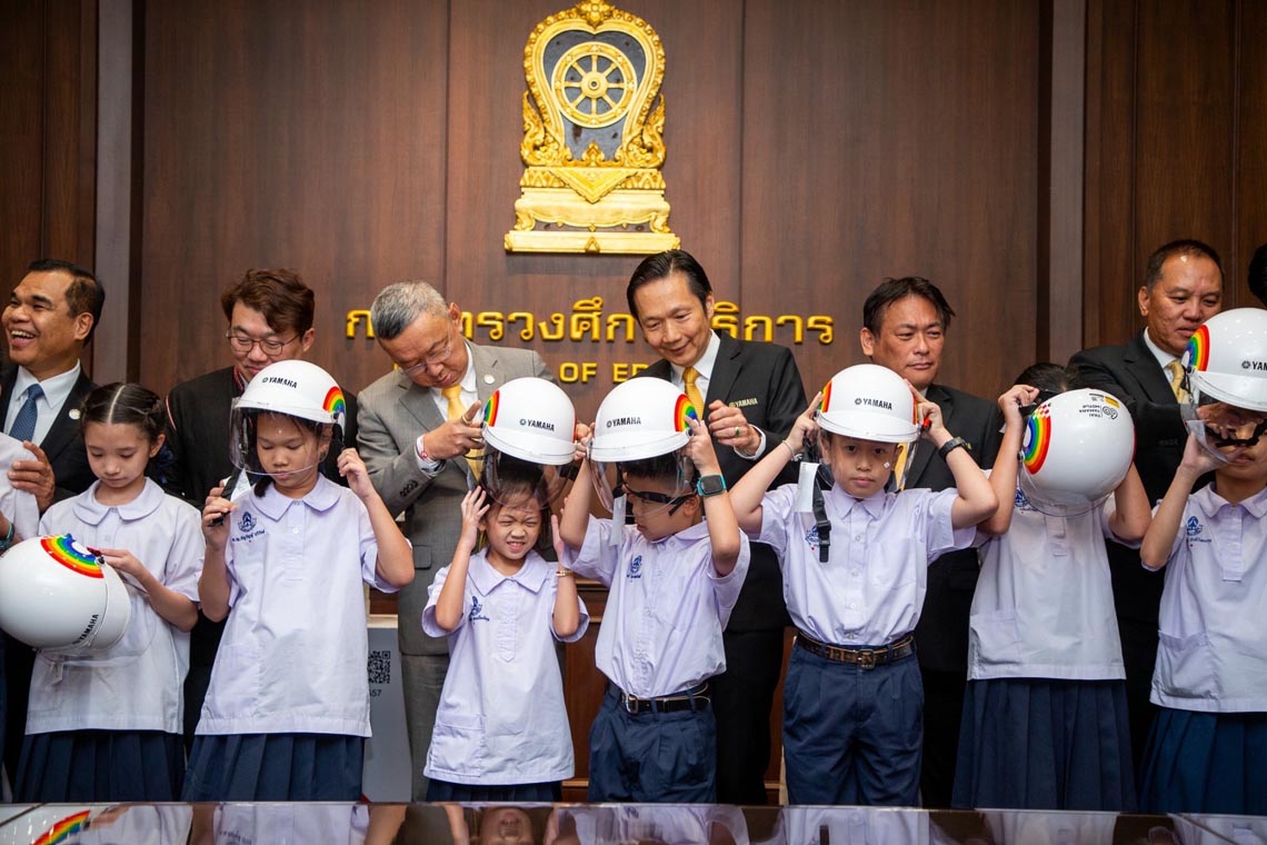 นายพงศธร เอื้อมงคลชัย ประธานกรรมการบริหาร มร.ฮิเดฮิโกะ ทาคากิ รองประธานกรรมการบริหาร นายภาณุพล กิตติคำรณ ผู้จัดการใหญ่ด้านการค้า นายอุกฤษณ์ ภาควิวรรธ รองผู้จัดการใหญ่ด้านวางแผนการค้า และการตลาด บริษัท ไทยยามาฮ่ามอเตอร์ จำกัด ร่วมกันมอบหมวกนิรภัยขนาดเล็กที่ได้มาตรฐานอุตสาหกรรม (มอก.) จำนวน 7,700 ใบ รวมมูลค่า 2,695,000 บาท ให้กับโรงเรียนระดับประถมศึกษา 77 จังหวัดทั่วประเทศ โดยได้รับเกียรติจาก พล.ต.อ.เพิ่มพูน ชิดชอบ รัฐมนตรีว่าการกระทรวงศึกษาธิการ ว่าที่ ร.ต.ธนุ วงษ์จินดา เลขาธิการคณะกรรมการการศึกษาขั้นพื้นฐาน และนายยศพล เวณุโกเศศ เลขาธิการคณะกรรมการการอาชีวศึกษา ร่วมกันรับมอบ และพร้อมแจกจ่ายให้กับโรงเรียนในระดับประถมศึกษาทั้ง 77 จังหวัด ทั่วประเทศ โดยแจกจ่ายออกจังหวัดละ 100 ใบ รวมทั้งสิ้น 7,700 ใบ เพื่อเสริมความปลอดภัยให้กับนักเรียนเยาวชน รวมถึงสุภาพสตรีที่มีศีรษะขนาดเล็ก ให้ได้สวมหมวกนิรภัยที่มีมาตรฐานรับรอง เพื่อความปลอดภัย ลดการสูญเสียและรณรงค์การสวมใส่หมวกนิรภัยทุกครั้งที่ขับขี่รถจักรยานยนต์ด้วย