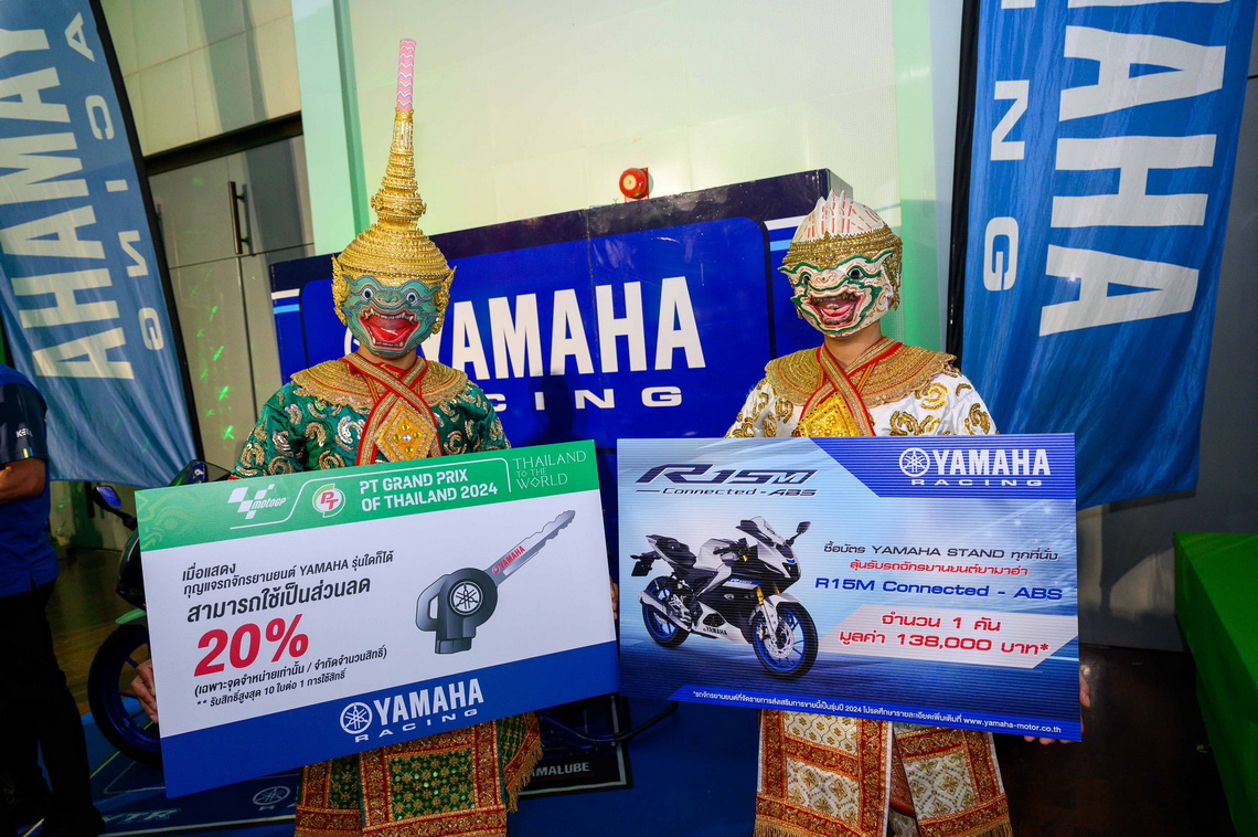 นายภาณุพล กิตติคำรณ ผู้จัดการใหญ่ด้านการค้า พร้อมผู้บริหารระดับสูง บริษัท ไทยยามาฮ่ามอเตอร์ จำกัด ถ่ายภาพร่วมกับ ดร.ก้องศักด ยอดมณี ผู้ว่าการการกีฬาแห่งประเทศไทย, นายรังสรรค์ พวงปราง ผู้ช่วยกรรมการผู้จัดการใหญ่ บริษัท พีทีจี เอ็นเนอยี จำกัด (มหาชน) หรือ PTG, มร.เฟร์ราน จุงก้า ผู้อำนวยการอาวุโส ด้านผู้สนับสนุนระดับโลก ดอร์น่าสปอร์ต นายโชติชนก ชิดชอบ ผู้อำนวยการฝ่ายกิจกรรมต่างประเทศ บริษัท บุรีรัมย์ยูไนเต็ด อินเตอร์เนชั่นแนล เซอร์กิต จำกัด และนายตนัยศิริ ชาญวิทยารมณ์ กรรมการผู้อำนวยการสนามช้าง อินเตอร์เนชั่นแนล เซอร์กิต ในพิธีแถลงข่าวการจำหน่ายบัตรชมการแข่งขัน MotoGP 2024 รายการ PT Grand Prix of Thailand 2024 ที่จะมีขึ้น ณ สนามช้าง อินเตอร์เนชั่นแนล เซอร์กิต จ.บุรีรัมย์ ระหว่างวันที่ 25 – 27 ตุลาคม 2567 นี้ โดยในปีนี้ยามาฮ่ามอบสิทธิพิเศษสำหรับลูกค้ารถจักรยานยนต์ยามาฮ่าที่ซื้อบัตรชมการแข่งขัน เพียงแสดงกุญแจรถจักรยานยนต์ยามาฮ่าทุกรุ่น รับสิทธิ์ส่วนลด 20% (1 สิทธิ์สามารถซื้อได้ 10 ใบ และจำนวนจำกัดเพียง 1,000 ที่นั่งเท่านั้น) พร้อมสิทธิ์ลุ้นชิงรถจักรยานยนต์ YAMAHA R15M Connected-ABS มูลค่า 138,000 บาท จำนวน 1 คัน เมื่อซื้อบัตรชมเฉพาะ YAMAHA Stand ทุกที่นั่ง