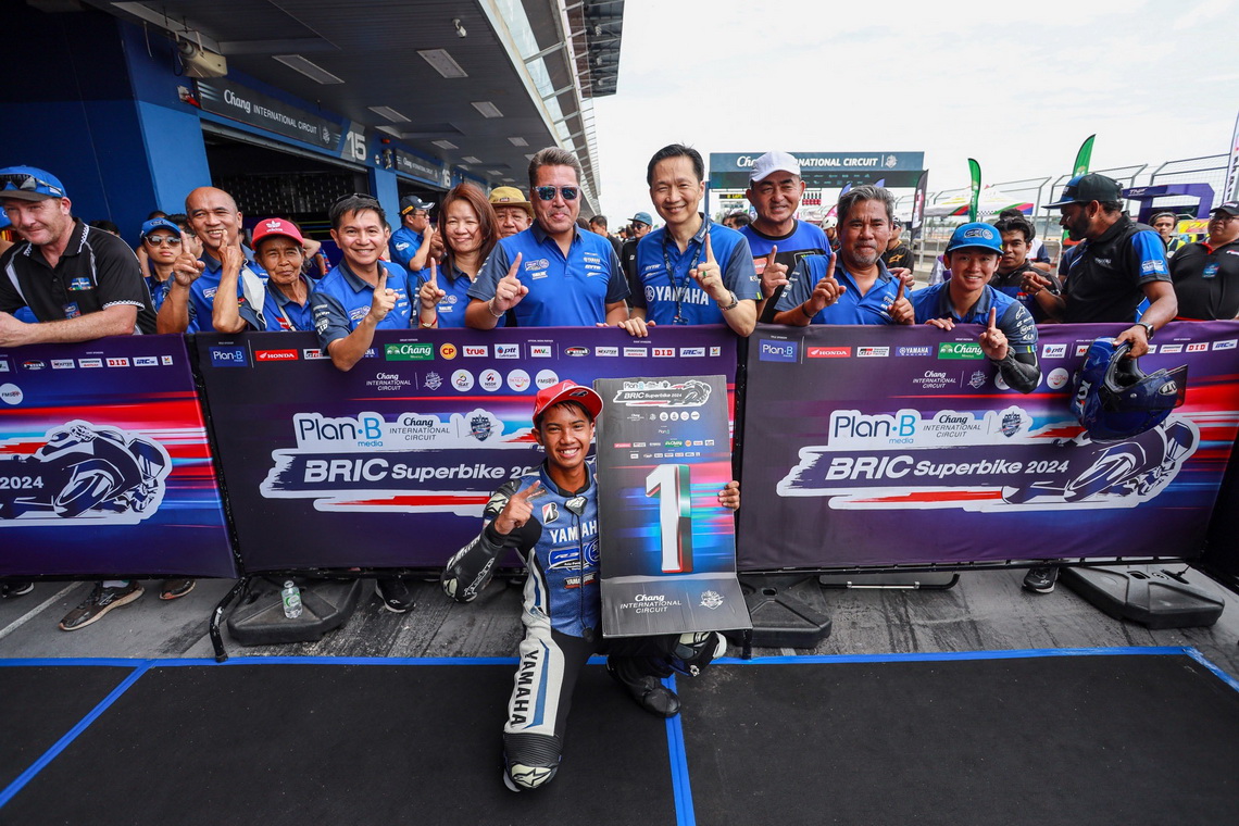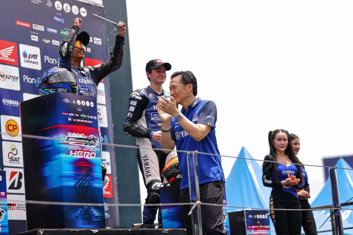 นายพงศธร เอื้อมงคลชัย ประธานกรรมการบริหาร บริษัท ไทยยามาฮ่ามอเตอร์ จำกัด มอบรางวัลไวลด์การ์ดเข้าร่วมการแข่งขัน YAMAHA R3 bLU cRU Super Finale ให้กับ เชลล์ ศักดิ์ชัย คงดวงดี ดาวรุ่งนักบิดวัย 14 และ คาเครุ โอกุนุกิ นักบิดแดนปลาดิบ และร่วมถ่ายภาพพร้อมกับขุนพลนักบิดในรายการ YAMAHA R3 bLU cRU Asia-Pacific 2024