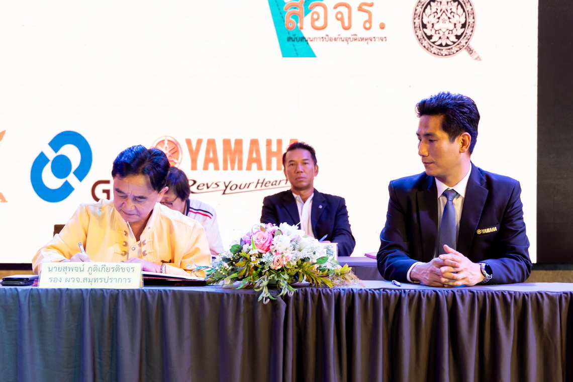 นายอุกฤษณ์ ภาควิวรรธ รองผู้จัดการใหญ่ด้านวางแผนการค้า และการตลาด บริษัท ไทยยามาฮ่ามอเตอร์ จำกัด ถ่ายภาพร่วมกับ นายสุพจน์ ภูมิเกียรติขจร รองผู้ว่าราชการจังหวัดสมุทรปราการ ในการเข้าร่วมลงนามบันทึกข้อตกลงความร่วมมือ (MOU) การดำเนินมาตรการองค์กรด้านการป้องกัน และลดอุบัติเหตุทางถนนในสถานประกอบการ พื้นที่จังหวัดสมุทรปราการ ซึ่งดำเนินโครงการโดยหน่วยงานศูนย์อำนวยการความปลอดภัยทางถนนจังหวัดสมุทรปราการ