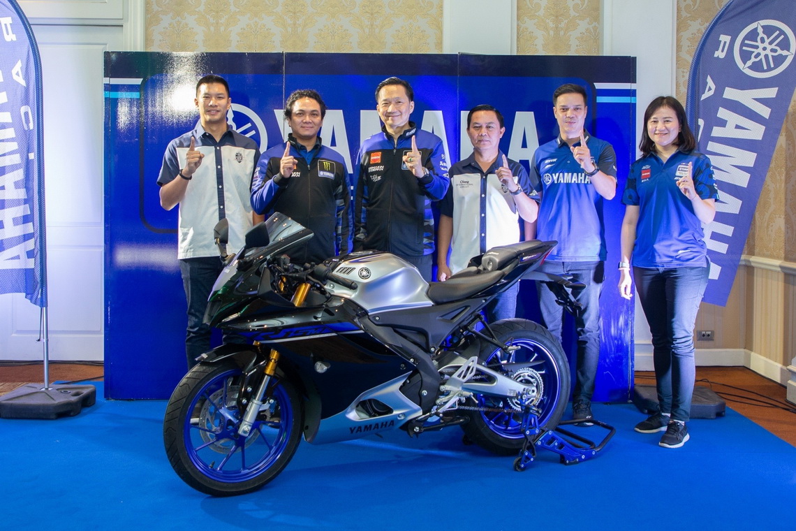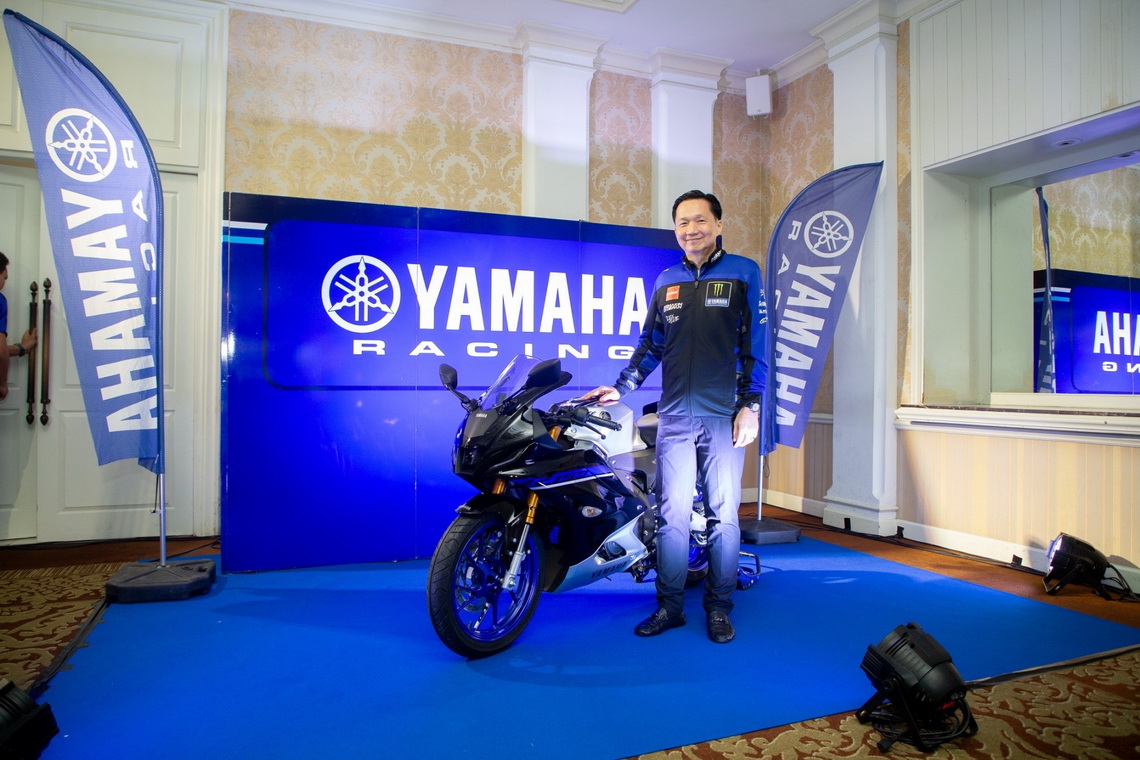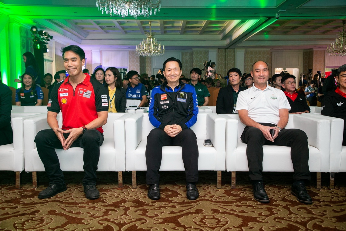 นายพงศธร เอื้อมงคลชัย ประธานกรรมการบริหาร นายจิรภัทร สายเพชร ผู้จัดการทั่วไปฝ่ายการตลาดกลุ่มรถออโตเมติก และสนับสนุนการตลาด บริษัท ไทยยามาฮ่ามอเตอร์ จำกัด ถ่ายภาพร่วมกับ ดร.ก้องศักด ยอดมณี ผู้ว่าการการกีฬาแห่งประเทศไทย นายโชติชนก ชิดชอบ ผู้อำนวยการฝ่ายกิจกรรมต่างประเทศ สนามช้าง อินเตอร์เนชั่นแนล เซอร์กิต ในงานแถลงข่าวนับถอยหลังสู่กรังด์ปรีซ์บนแผ่นดินไทย พร้อมเปิดตัวถ้วยรางวัล