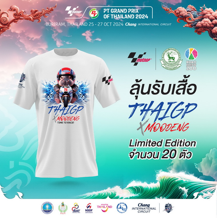 เด้งที่ 2 ลุ้นรับเสื้อ MOODENG Limited Edition พิเศษ สำหรับแฟนๆโมโตจีพี เพียง 20 ตัว ในโลกเท่านั้น! ตัวเสื้อเป็นสีขาว เนื้อผ้าสวมใส่สบาย ด้านหน้าเป็นมีมใหม่สุดคิ้วท์ “หมูเด้งเรซซิ่ง” พร้อมข้อความ Time to Race สร้างคาแร็กเตอร์ใหม่ให้ซูเปอร์สตาร์แห่งสวนสัตว์เปิดเขาเขียว สวมบทบาทนักบิดตัวกลมควบรถแข่งโมโตจีพีแบบตะมุตะมิ ที่เชื่อว่าจะกลายเป็นของแรร์ ไอเท็ม มีค่าหายาก สำหรับคนรักหมูเด้งทั่วโลกแน่นอน จากผู้ชมโมโตจีพี สนามประเทศไทยมากกว่า 2 แสนคน จะมีผู้โชคดี เพียง 20 คนเท่านั้น โดย Random ผู้โชคดีจากเลขหลังบัตรในระบบ Allticket ประกาศผลวันที่ 4 พ.ย. 67 ทางเพจ Chang Circuit Buriram