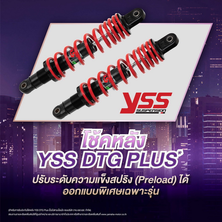 - การรับประกันโช้คหลัง YSS DTG Plus (ออกแบบพิเศษเฉพาะรุ่น) จะได้รับการรับประกันเป็นระยะเวลา 6 เดือน หรือ 10,000 กม. (แล้วแต่ระยะใดถึงก่อน) โดย บริษัท วาย.เอส.เอส. จำกัด และเงื่อนไขการรับประกันอื่นๆ เป็นไปตามที่ บริษัท วาย.เอส.เอส. จำกัด กำหนด โดยลูกค้าต้องทำการลงทะเบียนรับสิทธิ์การรับประกันกับบริษัท วาย.เอส.เอส. จำกัด ภายใน 15 วัน นับจากวันที่ลูกค้าทำการรับรถ ผ่านการสแกน QR CODE ใบรับประกันสินค้า โดยใช้หมายเลขสินค้า (YSS SERIAL NUMBER) คู่กับรหัสสินค้า (PRODUCT CODE) ของโช้คอัพที่ติดตั้งไปกับรถจักรยานยนต์คันที่ลูกค้าได้ซื้อไป