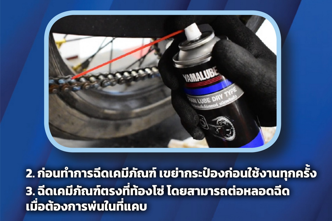 สำหรับวิธีการใช้งาน ยามาลู้ป จาระบีหล่อลื่นโซ่สเตอร์ ชนิดแห้งเร็ว (YAMALUBE CHAIN LUBE DRY TYPE) ให้มีประสิทธิภาพสูงสุด มีดังนี้