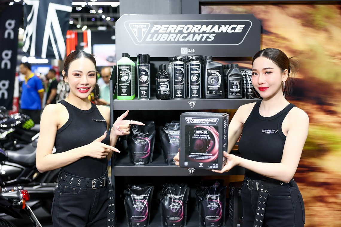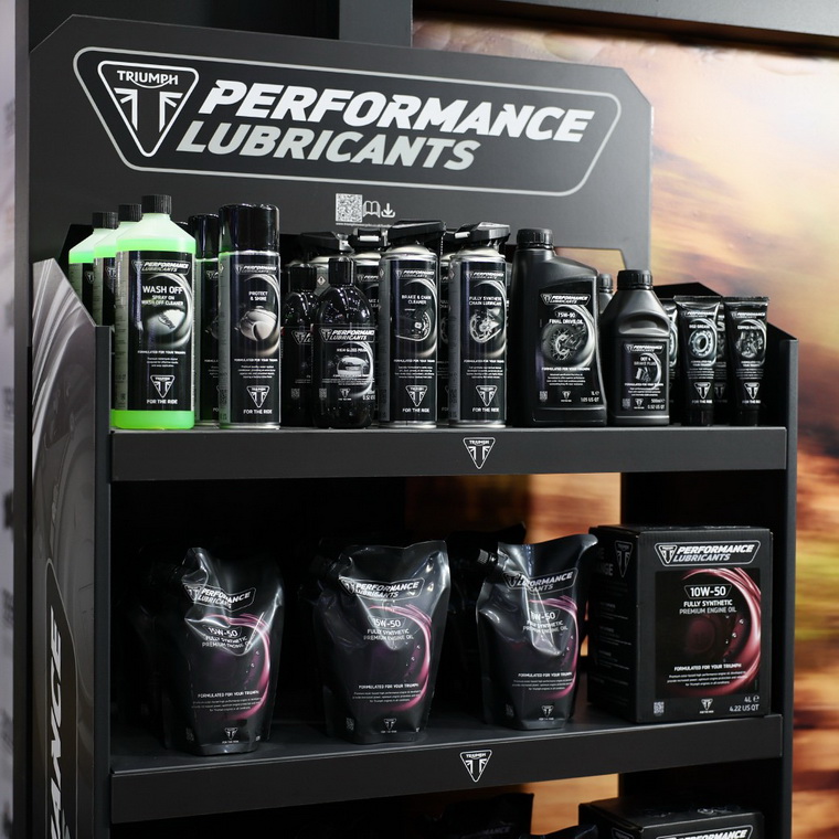พร้อมกันนี้ยังมี Triumph Performance Lubricants ผลิตภัณฑ์หล่อลื่นและบำรุงรักษารถจักรยานยนต์ไทรอัมพ์ที่คุณรัก อาทิ ผลิตภัณฑ์หล่อลื่นเครื่องยนต์ ผลิตภัณฑ์หล่อลื่นโซ่ ผลิตภัณฑ์ทำความสะอาดเบรกและโซ่ ผลิตภัณฑ์ทำความสะอาดพื้นผิวรถจักรยานยนต์ ฯลฯ เป็นต้น ซึ่งเป็นผลิตภัณฑ์ระดับพรีเมียมเพื่อให้ลูกค้าได้นำไปดูแลรถจักรยานยนต์ไทรอัมพ์ได้อย่างมั่นใจอีกด้วย