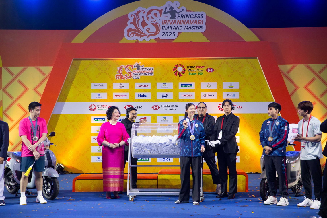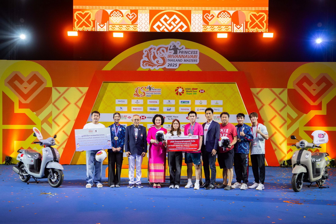 นายอุกฤษณ์ ภาควิวรรธ รองผู้จัดการใหญ่ด้านวางแผนการค้า และการตลาด บริษัท ไทยยามาฮ่ามอเตอร์ จำกัด ถ่ายภาพร่วมกับ คุณหญิงปัทมา ลีสวัสดิ์ตระกูล กรรมการคณะกรรมการโอลิมปิกสากล, รองประธานสหพันธ์แบดมินตันโลก และนายกสมาคมกีฬาแบดมินตันแห่งประเทศไทย ในพระบรมราชูปถัมภ์ และนายภูมิพัฒน์ ฉัตรศรัณวัฒน์ กรรมการ มูลนิธิความปลอดภัยทางถนน ในการมอบรถจักรยานยนต์ยามาฮ่า ฟาซซิโอ้ รุ่น Smart Key จำนวน 2 คัน รวมมูลค่า 111,000 บาท ให้กับผู้โชคดีที่เข้าชมการแข่งขันแบดมินตันรายการ ปริ๊นเซส สิริวัณณวรี ไทยแลนด์ มาสเตอร์ส 2025 ชิงถ้วยพระราชทานสมเด็จพระเจ้าลูกเธอ เจ้าฟ้าสิริวัณณวรี นารีรัตนราชกัญญา ซึ่งเป็นการแข่งขันแบดมินตันระดับเวิลด์ทัวร์ที่จะเก็บสะสมคะแนนอันดับโลก ชิงเงินรางวัลรวม 8,160,000 บาท