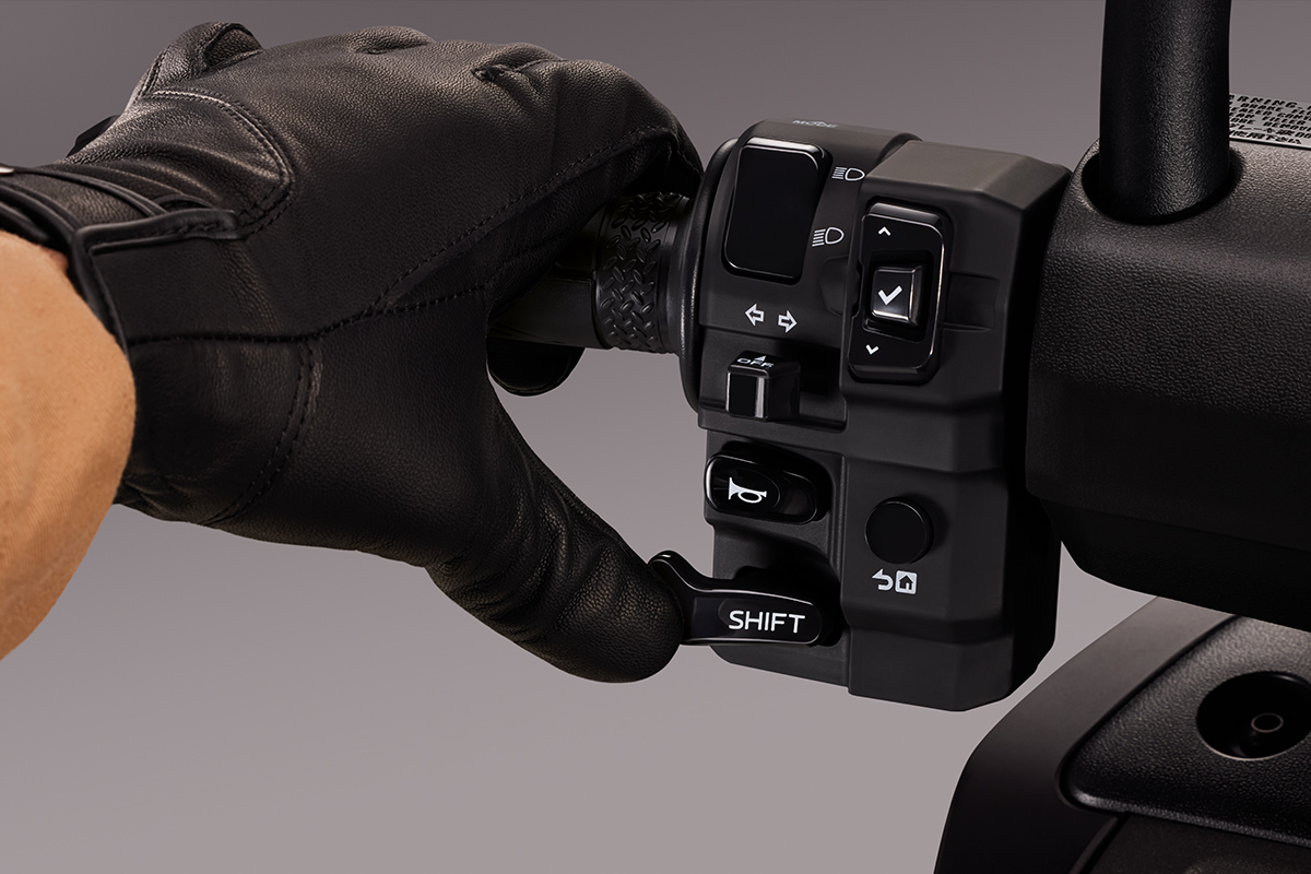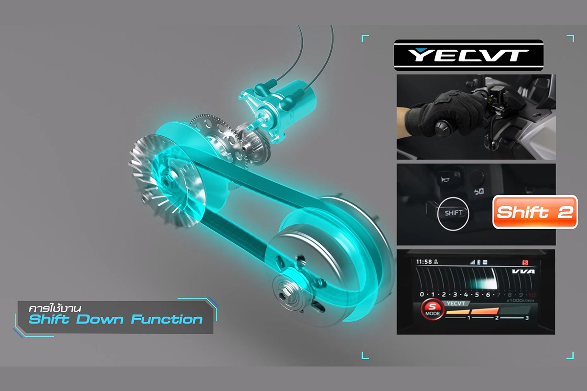 -ปิดคันเร่ง และกดปุ่ม Shift เพื่อสร้างแรงเบรกจากเครื่องยนต์ (Engine Brake) โดย ECU จะปรับอัตราทดของเครื่องยนต์ ทำให้เกิดแรงต้าน และความเร็วของรถจะลดลงเร็วกว่าการปิดคันเร่งเพียงอย่างเดียว โดยสามารถลดได้ 3 ระดับ