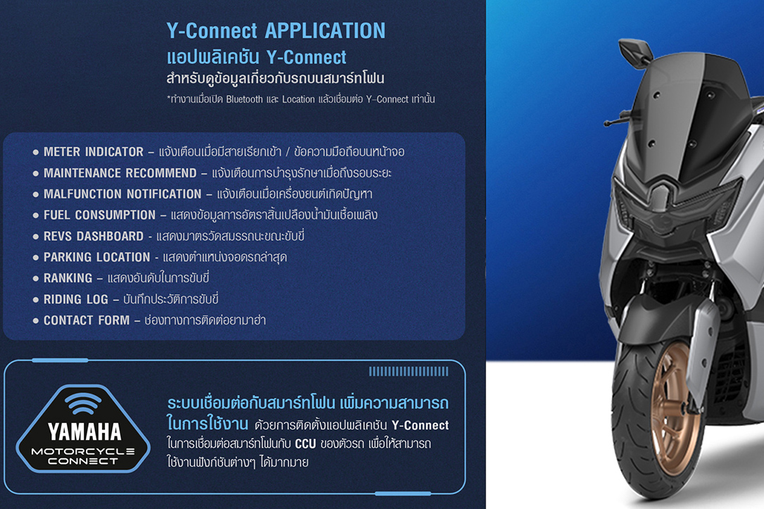 ALL NEW NMAX & ALL NEW NMAX TECH MAX ล้ำสมัยด้วย การติดตั้งแอปพลิเคชัน Y-Connect ในการเชื่อมต่อสมาร์ทโฟน CCU ของตัวรถ เพื่อให้สามารถใช้งานฟังก์ชันต่างๆ ได้มากมายบนสมาร์ทโฟน ดังนี้...