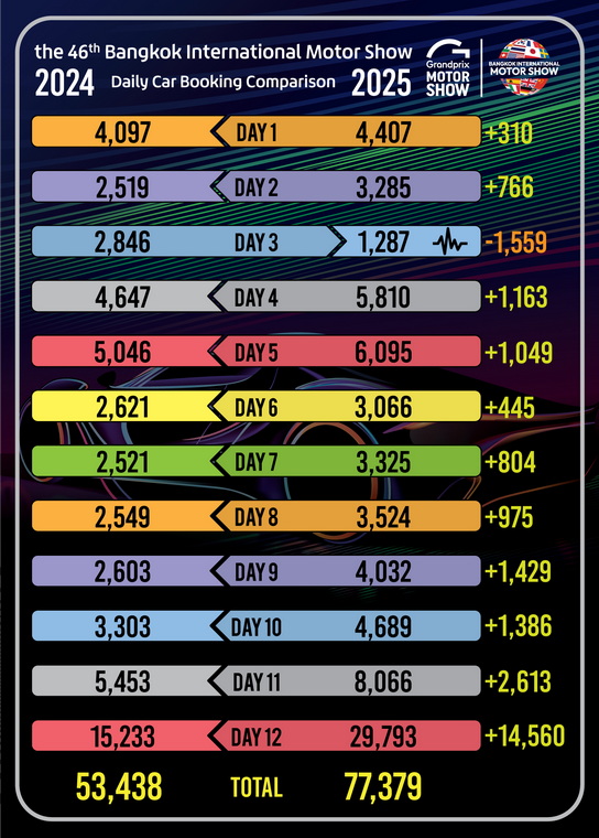 ด้านของยอดจองรถยนต์และรถจักรยานยนต์ที่เกิดขึ้นภายในงาน มียอดรวมทั้งสิ้น 79,941 คัน แบ่งออกเป็นรถยนต์ 77,379 คัน ขณะที่รถจักรยานยนต์มียอดจองในปีนี้มี 2,562 คัน จากตัวเลขดังกล่าว พบว่าสัดส่วนยอดจองรถภายในงาน แบ่งออกเป็นรถในกลุ่ม xEV มียอดจองอยู่มากกว่า 65% โดยเฉพาะประเภทเอสยูวีที่ได้รับความนิยมเพิ่มขึ้นเป็นอย่างมาก ส่วนรถเครื่องยนต์สันดาปมีสัดส่วนอยู่ที่ 35%