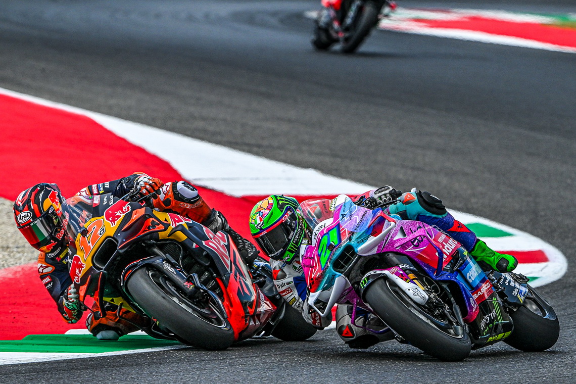 ในช่วงท้ายเกมเมื่อ Marc และ Álex Marquez ครองอันดับ 1 และ 2 แล้วนั้น การแย่งตำแหน่งอันดับ 3 กลายเป็นไคลแม็กซ์ เมื่อ Di Giannantonio ไล่บี้และแซง Bagnaia ได้ในโค้งที่ 6 พร้อมเร่งไล่พี่น้อง Marquez แต่สุดท้ายก็เข้าเส้นชัยในอันดับ 3 ตามหลัง Álex แบบไม่ห่าง ส่วน Bagnaia ต้องจบเพียงอันดับ 4 ทั้งที่ออกสตาร์ทได้อย่างยอดเยี่ยม ถือเป็นวันที่น่าผิดหวังในบ้านเกิด เช่นเดียวกับ Bezzecchi ที่จบอันดับ 5 ให้กับ Aprilia บนแผ่นดินอิตาลีเช่นกัน