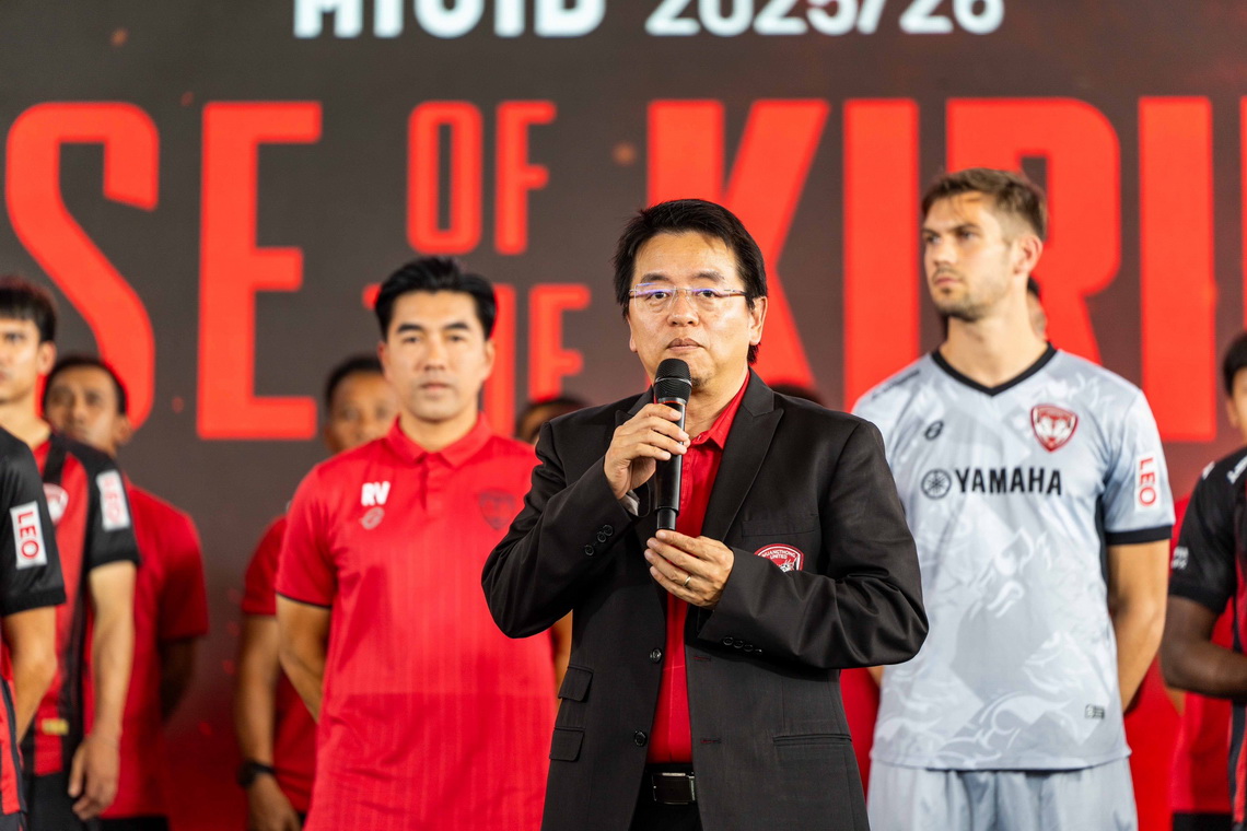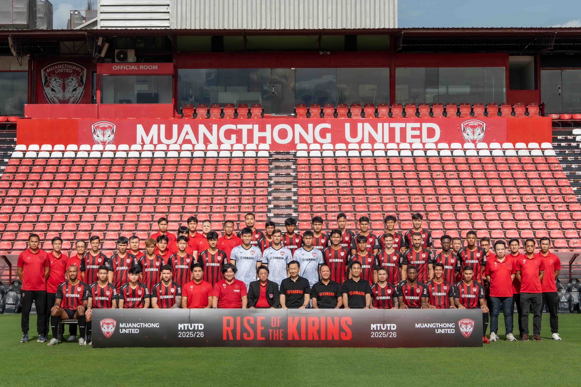 นายพงศธร เอื้อมงคลชัย ประธานกรรมการบริหาร นายภาณุพล กิตติคำรณ ผู้จัดการใหญ่ด้านการค้า นายอุกฤษณ์ ภาควิวรรธ รองผู้จัดการใหญ่ด้านวางแผนการค้า และการตลาด บริษัท ไทยยามาฮ่ามอเตอร์ จำกัด ถ่ายภาพร่วมกับนายวิลักษณ์ โหลทอง ประธานสโมสรเมืองทอง ยูไนเต็ด นายรณฤทธิ์ ซื่อวาจา ผู้อำนวยการสโมสรเมืองทอง ยูไนเต็ด พร้อมด้วยแข้งดัง ในงานแถลงข่าวเปิดตัวสโมสรเมืองทอง ยูไนเต็ด ภายใต้แคมเปญ “RISE of the KIRIN” กิเลนผยอง...ทะยานสู่ความสำเร็จยุคใหม่
