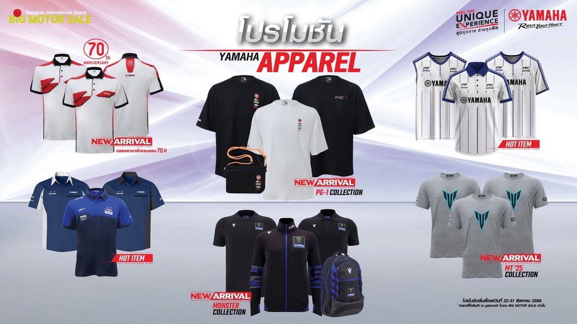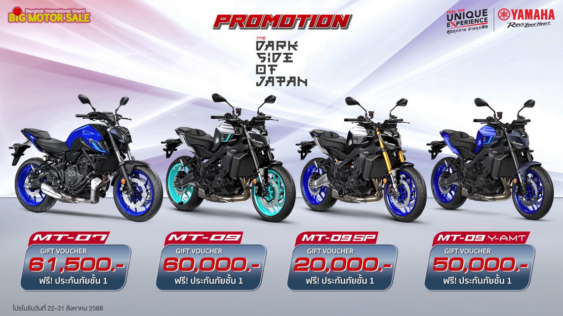 บริษัท ไทยยามาฮ่ามอเตอร์ จำกัด จัดเต็มโปรโมชันสุดพิเศษ เมื่อซื้อรถจักรยานยนต์ยามาฮ่าทุกรุ่นภายในงาน บิ๊ก มอเตอร์เซล 2025 จัดเต็ม ! Gift Voucher ส่วนลดสูงสุด 75,000 บาท พร้อมประกันภัยชั้น 1 เมื่อซื้อ XSR900 หรือเลือกซื้อ MT-07 รับ Gift Voucher ส่วนลดสูงสุด 61,500 บาท พร้อมประกันภัยชั้น 1 ซื้อ MT-09 Y-AMT, Tracer9 GT+ และ Tenere700 รับ Gift Voucher 50,000 บาท และประกันภัยชั้น 1 พร้อมพิเศษชุดแต่งจาก Touratech สำหรับ Tenere700 ซื้อ R7 รับ Gift Voucher 26,000 บาท พร้อมประกันภัยชั้น 1 ซื้อ MT-09SP รับทันที Gift Voucher 20,000 บาท พร้อมประกันภัยชั้น 1 และ ซื้อ New TMAX 2025 รับฟรีประกันภัยชั้น 1