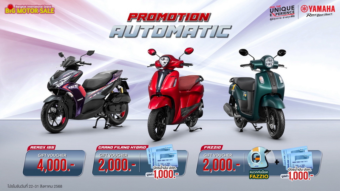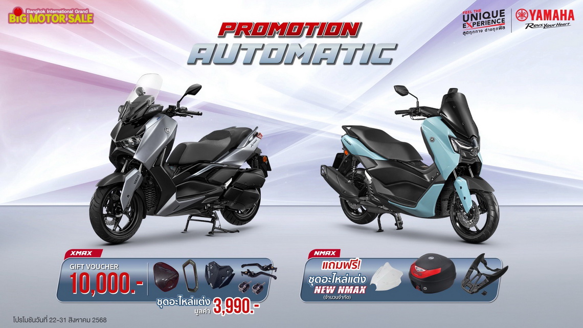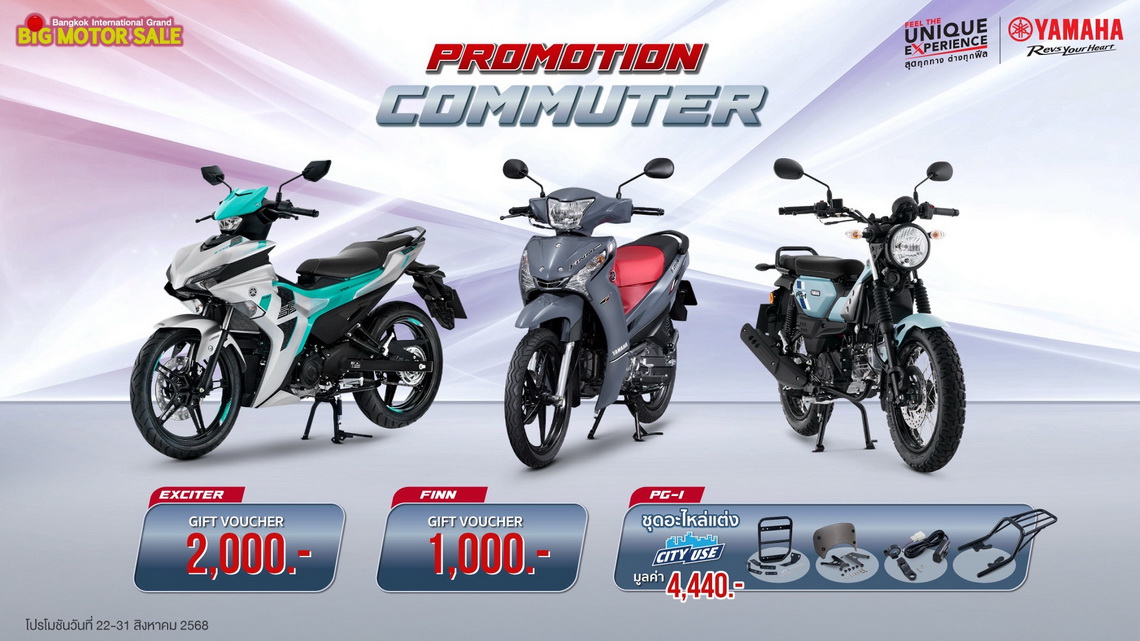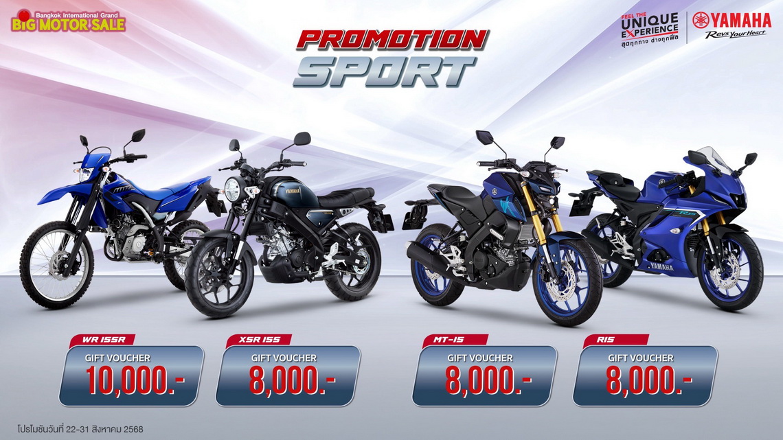 พบกับโปรโมชันสุดพิเศษจากยามาฮ่าได้ที่ บูธ YAMAHA Feel the Unique Experience สุดทุกทาง...ต่างทุกฟีล สุดทุกเส้นทางในรูปแบบที่เป็นคุณ ในงาน BIG MOTOR SALE 2025 ได้ระหว่างวันที่ 22 – 31 สิงหาคม 2568 นี้
