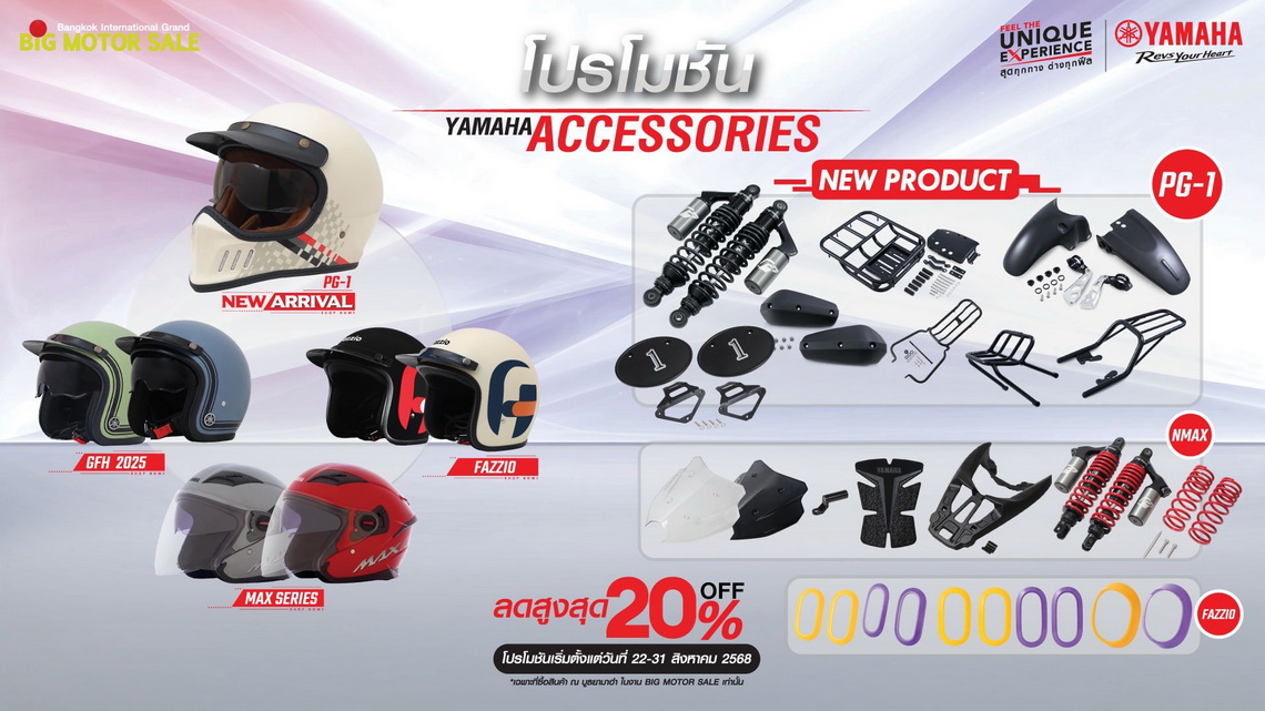 สำหรับในส่วนของรถจักรยานยนต์ขนาดไม่เกิน 400 ซีซี ซื้อ New YAMAHA PG-1 รับฟรีชุดแต่ง City use พร้อมแคร์สุดx2 ฟรี ! ประกันอุบัติเหตุชดเชยรวมสูงสุด 45,000 บาท ซื้อ All New YAMAHA NMAX 2025 รับฟรีชุดแต่ง All New NMAX (จำนวนจำกัด) ซื้อ XMAX300 รับฟรี Gift Voucher 10,000 บาท พร้อมชุดอะไหล่ตกแต่งมูลค่า 3,990 บาท (จำนวนจำกัด) ซื้อ AEROX รับ Gift Voucher มูลค่า 4,000 บาท (จำนวนจำกัด) ซื้อ MT-15, XSR155 และ R15 รับฟรี Gift Voucher มูลค่า 8,000 บาท ซื้อ Grand Filano Hybrid รับฟรี Gift Voucher 2,000 บาท พร้อมบัตรน้ำมันมูลค่า 1,000 บาท (จำนวนจำกัด) ซื้อ FAZZIO Hybrid รับฟรี Gift Voucher 2,000 บาท พร้อมบัตรน้ำมันมูลค่า 1,000 บาท และโปรแคร์สุดx2 ชดเชยรายได้ถึง 30,000 บาทต่อปี ซื้อ FINN รับฟรี Gift Voucher 2,000 บาท พร้อมบัตรน้ำมันมูลค่า 1,000 บาท และโปรแคร์สุดx2 ชดเชยรายได้ถึง 30,000 บาทต่อปี ซื้อ Exciter รับฟรี Gift Voucher 2,000 บาท (จำนวนจำกัด) และซื้อ WR155 รับฟรี Gift Voucher 10,000 บาท พร้อมกับส่วนลดสูงสุด 50% สำหรับเสื้อผ้า และเครื่องแต่งกายลิขสิทธิ์แท้ยามาฮ่า หมวกกันน็อกและอุปกรณ์ตกแต่งลดสูงสุด 20% ผลิตภัณฑ์ยามาลู้ปลดสูงสุด 10%
