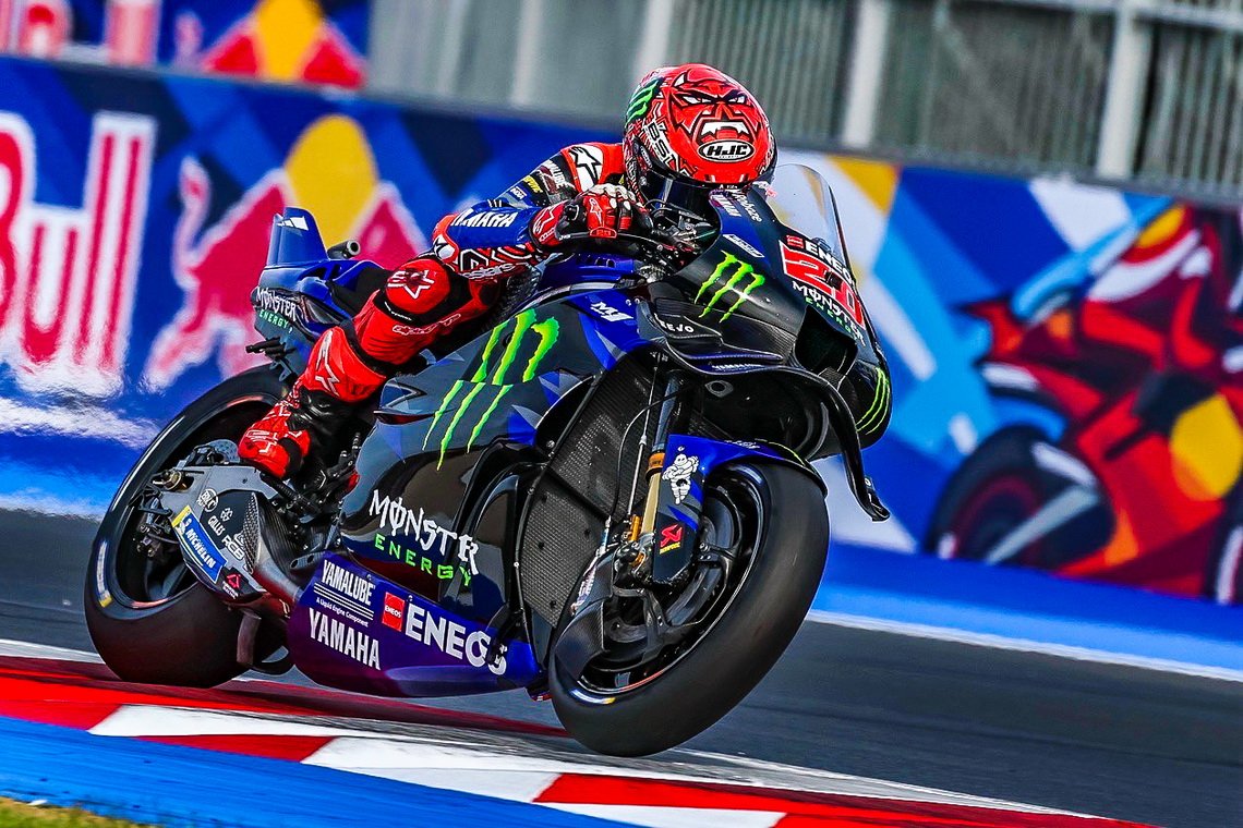 "เอลดิอาโบล" ฟาบิโอ กวาร์ตาราโร ยอดนักบิดเฟรนช์จาก มอนสเตอร์ ยามาฮ่า ควบรถแข่ง YZR-M1 เค้นสุดความสามารถบิดคว้าท็อป 8 ในศึก โมโตจีพี 2025 สนาม 16 รายการ ซาน มาริโน กรังด์ปรีซ์ ในเรซสุดหินเมื่อวันอาทิตย์ที่ผ่านมา ขณะรถต้นแบบ M1 V4 เปิดตัวยอดเยี่ยมกับเรซเป็นทางการครั้งแรก ที่ มิซาโน
