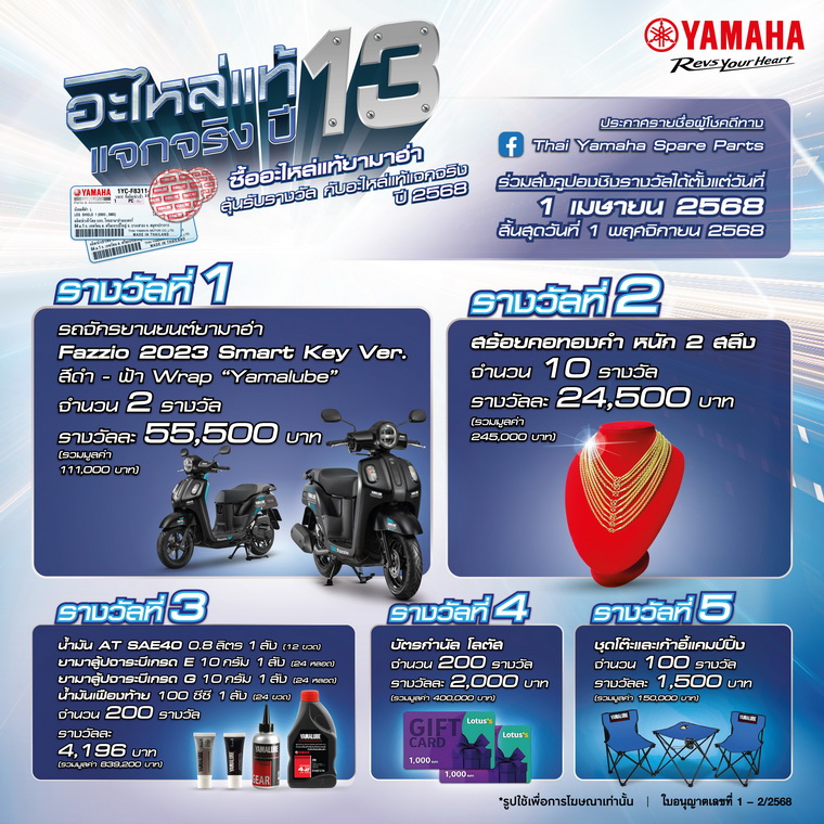 โดยแคมเปญ “อะไหล่แท้แจกจริงปี 13” จะมีการจับรางวัลครั้งที่ 2 ในวันที่ 17 พฤศจิกายน 2568...ใช้อะไหล่แท้ยามาฮ่า อย่าลืมสะสมสติกเกอร์ส่งเข้ามากันเยอะๆ ของรางวัลรวมแล้วมูลค่ามากกว่า 1.7 ล้านบาท!!!