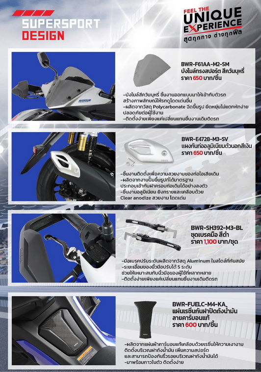 สำหรับ All New AEROX Customize ในสไตล์ Street Kit...Street Vibe and Excite feels ประกอบด้วย บังไมล์ทรงสปอร์ตสีควันบุหรี่ออกแบบให้เข้ากับตัวรถ เสริมลุคให้รถของคุณดูโดดเด่นยิ่งขึ้น, ชุดเบรกมือสีดำปรับระดับได้ถึง 5 ระดับ เพื่อให้เหมาะกับนิ้วมือของผู้ขับขี่แต่ละคน ผลิตจากอลูมิเนียมดีไซน์ทันสมัย, แผ่นเรซิ่นกันฝาปิดถังน้ำมันผลิตจากผ่นผ้าคาร์บอนแท้เคลือบด้วยเรซิ่นเพิ่มความเงางามและดูสปอร์ตยิ่งขึ้น, ชุดรองพักเท้าอลูมิเนียมดีไซน์ให้เข้ากับพื้นเดิม ผลิตจากอลูมิเนียมเคลือบด้วย Clear anodize พร้อมแผ่นยางใหม่ช่วยลดการลื่นของเท้าในขณะขับขี่ และแผงกันท่ออลูมิเนียมตัวนอกสีเงิน ผลิตจากอลูมิเนียมยิงทรายและเคลือบด้วย Clear anodize โดยสามารถประกอบเข้ากับฝาครอบท่อเดิมได้อย่างลงตัว