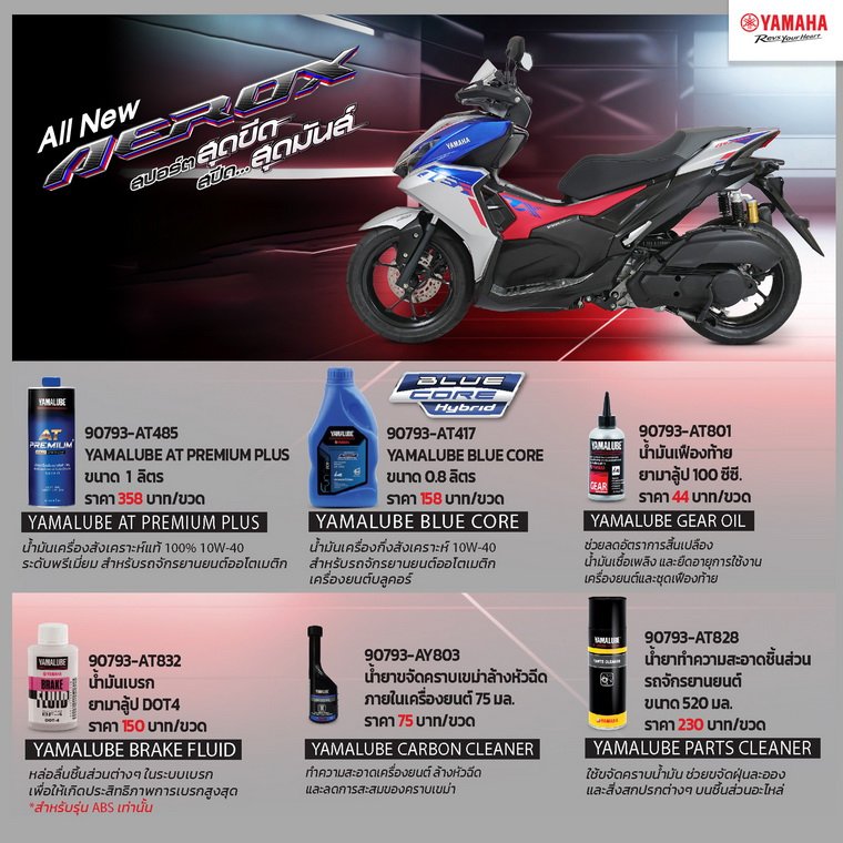 สำหรับ ACCESSORIES อุปกรณ์ตกแต่งยามาฮ่าแท้!...All New AEROX Customize ในสไตล์ Racing Kit…Race up Your Lift Style ประกอบไปด้วย บังไมล์ทรงสปอร์ตสีใสเพื่อเติมเต็มความรู้สึกแบบรถสปอร์ต, ชุดวิงเล็ทหน้าซ้าย-ขวาสีดำ ออกแบบ 2 ชั้นเข้ากับรูปทรงของตัวรถเหมือนรถสไตล์ Sport GP Bike, บังโคลนหน้าคาร์บอน ผลิตจากคาร์บอนแท้ขึ้นรูปเสริมด้วยเส้นใยไฟเบอร์กลาส รูปทรงใหม่ให้ฟิลลิ่ง Sport Racing ด้วยความยาวบังโคลนที่สั้นลง, ชุดการ์ดแฮนด์ซ้าย-ขวา พร้อมขายึดเหล็กที่มีความแข็งแรงไม่สั่น เพิ่มมิติของตัวรถและป้องกันมือผู้ขับขี่ในขณะขับขี่, ชุดท้ายสั้นตรงรุ่น ผลิตจากอลูมิเนียม CNC และปั้มขึ้นรูป เพิ่มความโฉมเฉี่ยวและความสปอร์ตให้กับตัวรถยิ่งขึ้น และเสริมสมรรถนะให้ดียิ่งขึ้นด้วยชุดโช้คอัพหลัง PROFENDER AEROX รุ่น AIR สปริงสีแดงและซับแทงค์ที่ออกแบบมาเฉพาะยามาฮ่า โดยสามารถปรับ Pre Load และ Rebound ได้ถึง 16 ระดับ