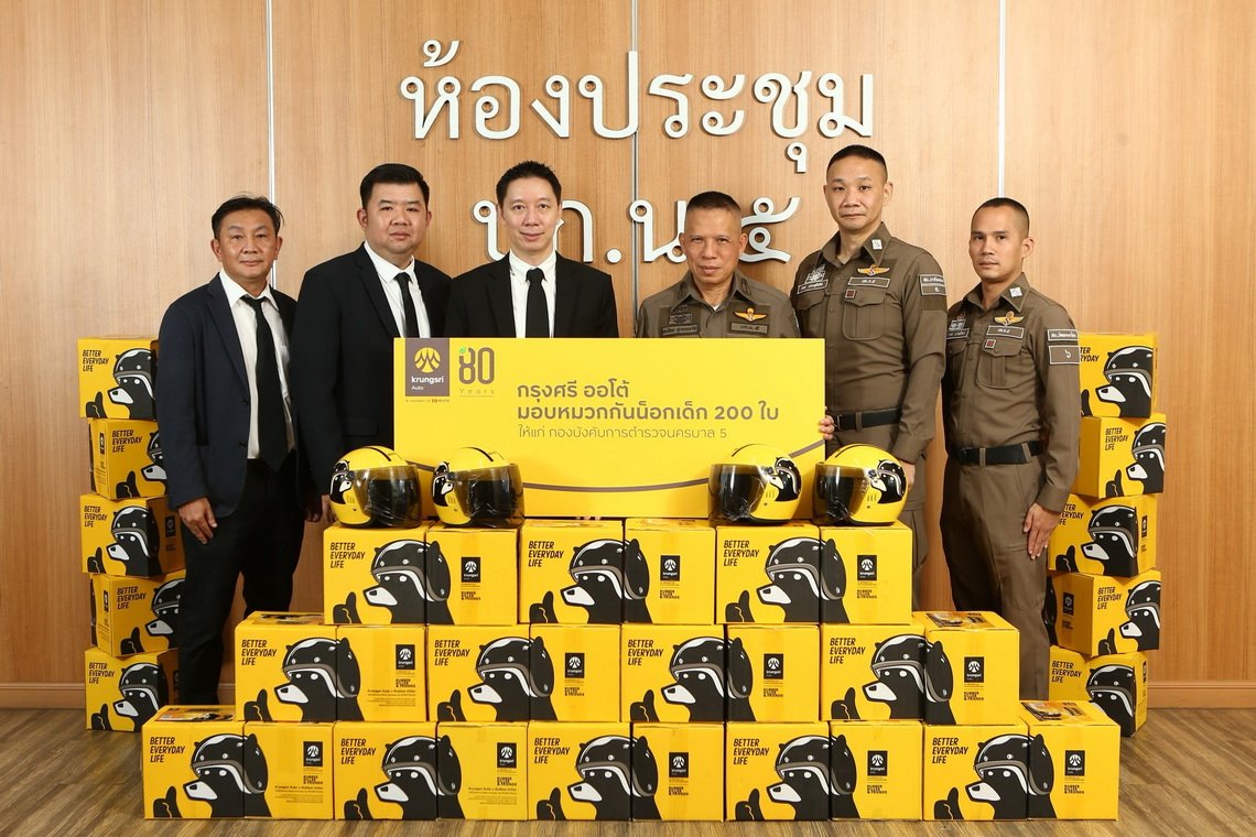 “กรุงศรี ออโต้” ผู้นำธุรกิจสินเชื่อยานยนต์ครบวงจร เครือธนาคารกรุงศรีอยุธยา จำกัด (มหาชน) นำโดย นายภูมิ นนท์รักษานุกูล ผู้อำนวยการอาวุโส ผู้บริหารสายงานบริหารความเสี่ยง ธุรกิจสินเชื่อยานยนต์ ธนาคารกรุงศรีอยุธยา จำกัด (มหาชน) ร่วมส่งมอบหมวกกันน็อกเด็กและสายคล้องหมวกกันน็อกเด็กจากแคมเปญ #สั่งก่อนเสีย (The Life Saver) ภายใต้โครงการ Krungsri Auto LET’sponsible ให้แก่กองบังคับการตำรวจนครบาล กองบังคับการตำรวจภูธรจังหวัด และกองบังคับการสืบสวนสอบสวนตำรวจภูธรภาค เพื่อเสริมสร้างความปลอดภัยโดยมุ่งลดความรุนแรงจากการบาดเจ็บและเสียชีวิตจากอุบัติเหตุรถจักรยานยนต์บนท้องถนนให้แก่กลุ่มเปราะบาง พร้อมรณรงค์ปลูกฝังพฤติกรรมของเด็กไทยช่วงอายุ 4-12 ปีและผู้ปกครองในการสวมหมวกกันน็อกให้กับเด็กทุกครั้ง เมื่อซ้อนท้ายรถจักรยานยนต์ ณ กองบังคับการตำรวจนครบาล 5 กองบัญชาการตำรวจนครบาล